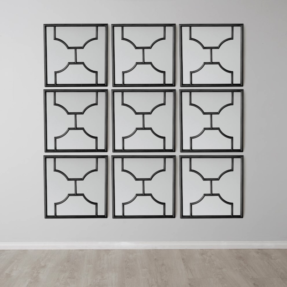 Evoking a sense of timeless elegance, the Tessellated Mirror seamlessly marries classical art deco inspiration with modern craftsmanship. At its heart lies a pristine square mirror, gracefully enveloped by a sleek black metal frame. The frame's intricate pattern, defined by striking lines and sweeping curves, acts as both a protective barrier and an artistic statement.