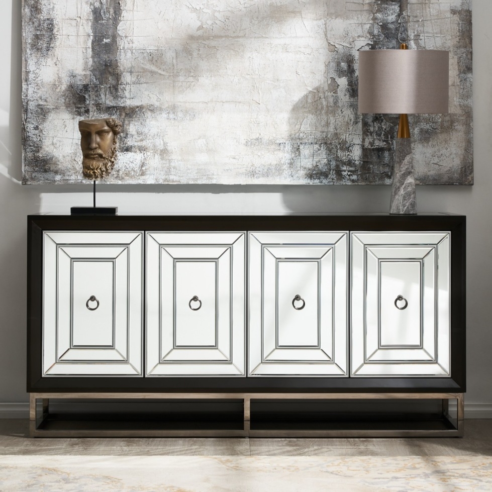 Reflect your living room in a new light with the exquisite Thalia Sideboard. This majestic piece makes for a fine addition to any living room with its exquisite, mirrored panels and striking stand-out design. Your prized cutlery, beautiful decorations and more will look terrific as it rests upon its dashing colours and finely crafted frame. This frame is made from high-quality wood draped in a sleek dark shade.
