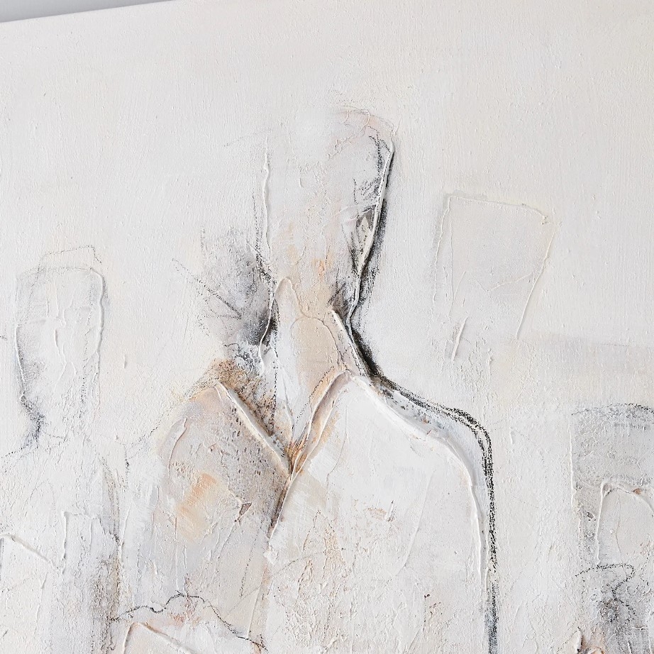 The Selves Neutral Colours Abstract Painting is a masterful blend of subtlety and intrigue. At first glance, the predominantly white canvas may seem simple, yet it's the faint silhouettes of what appear to be people that pull the observer into a deeper narrative.