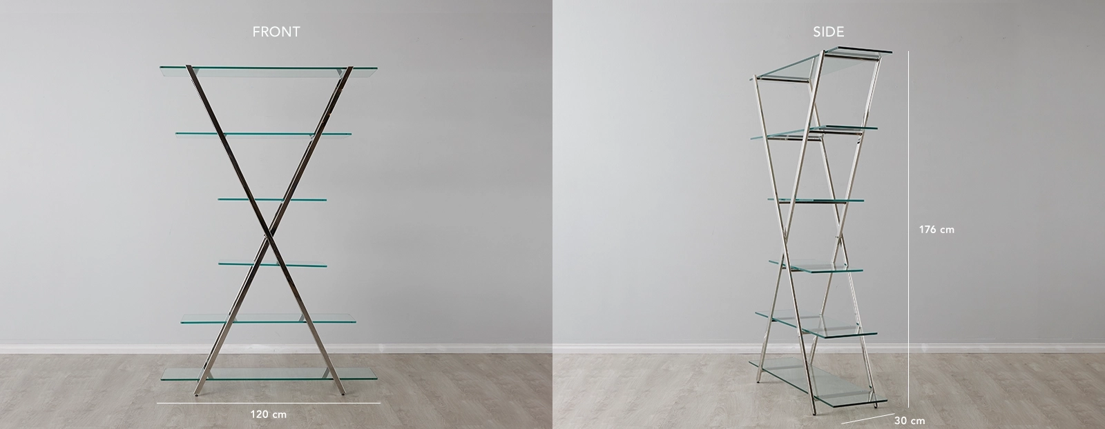Its cross-shaped frame and varying shelf lengths create a striking, multi-tiered design, with the gleaming metallic finish contrasting beautifully against the clear tempered glass.