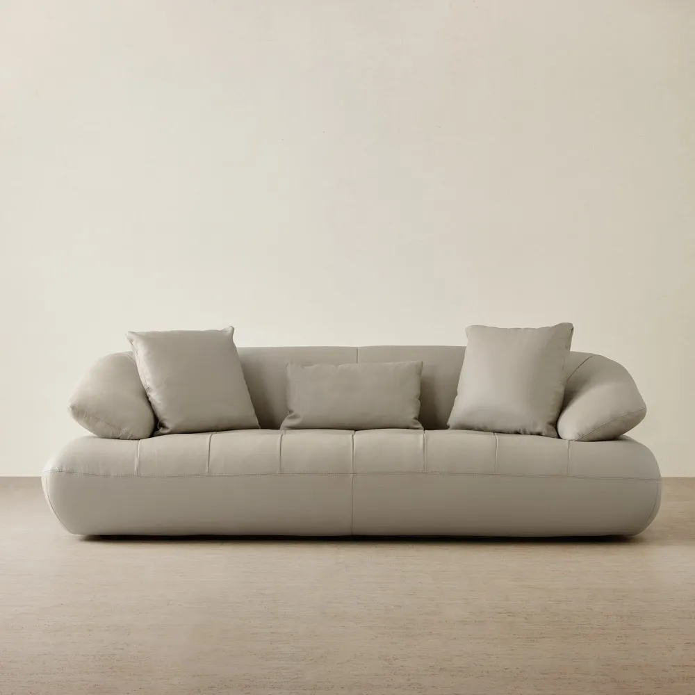 Supple leather wraps the Trinity Almond Cream 3-Seater Sofa, offering a soft, natural texture that exudes quiet luxury. Its generous cushions and smooth curves create a relaxed and inviting feel, perfect for everyday comfort.