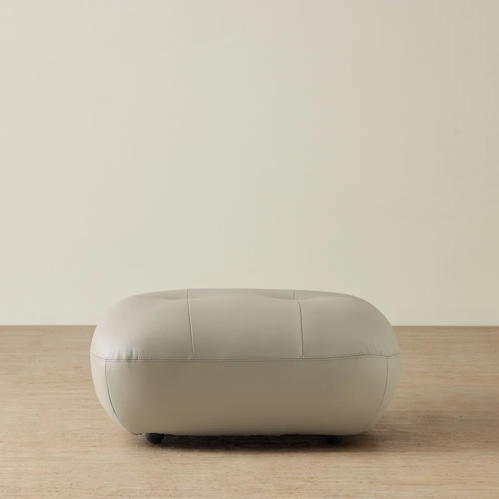 The Trinity Ottoman is upholstered in supple leather that feels smooth and refined to the touch. Its rounded edges and fine stitching reflect thoughtful craftsmanship and a soft, inviting character.
