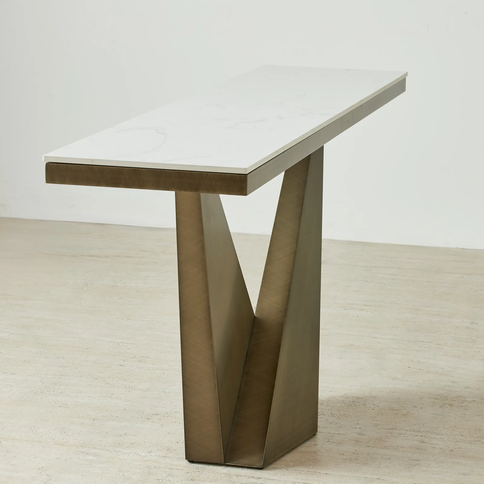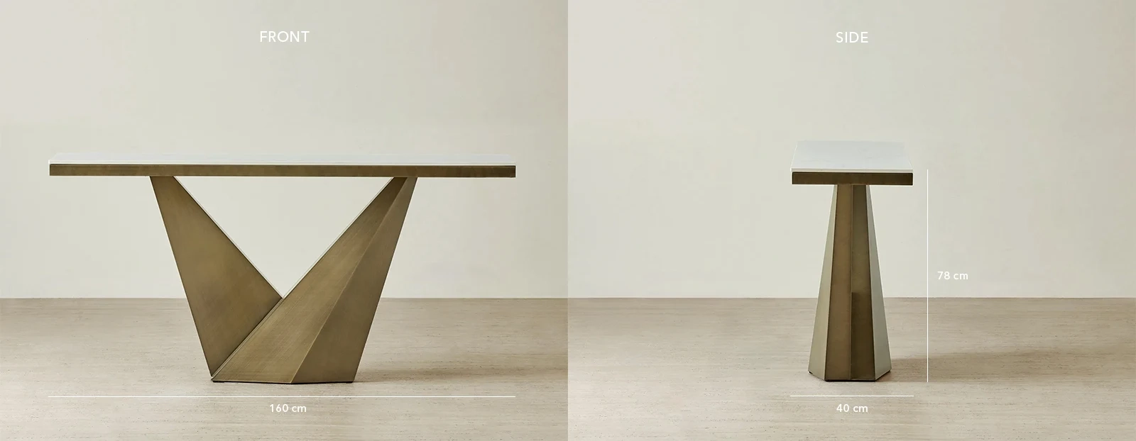 Supported by a striking brushed bronze base with sharp geometric lines, it delivers a bold architectural statement. With refined finishes and a commanding silhouette, Vania brings quiet luxury and structure to any hallway or living space.