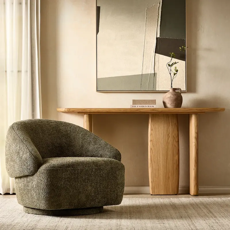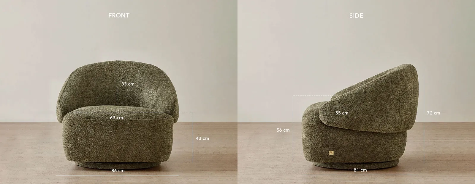 The textured woven fabric in winter moss tone adds warmth and depth to the design. Balanced and sculptural, the Verage offers both visual appeal and everyday ease.