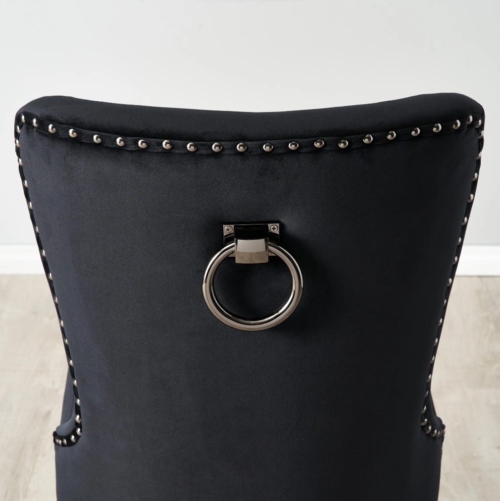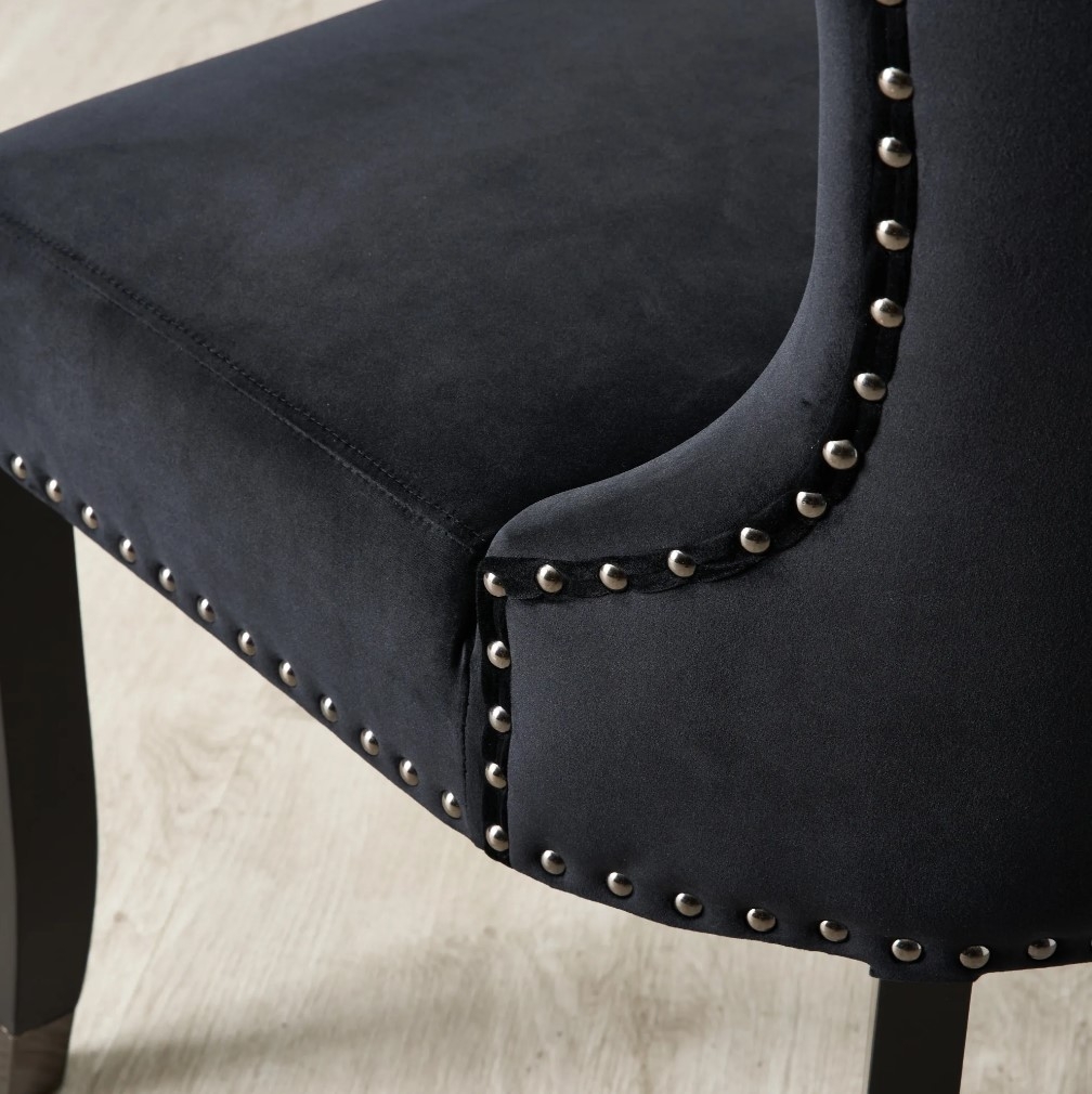 The frame is then expertly upholstered with luxe Black velvet fabric, adding a layer of opulence and sophistication. The silver studs that run along the outline of the chair serve as exquisite embellishments, enhancing the overall aesthetic and adding a touch of glamour. The button-tufted backrest of the Viktor Dining Chair adds a plush and distinct look, exuding elegance and refinement. To further enhance its luxurious aesthetic, the Viktor features an ornamental pull ring.