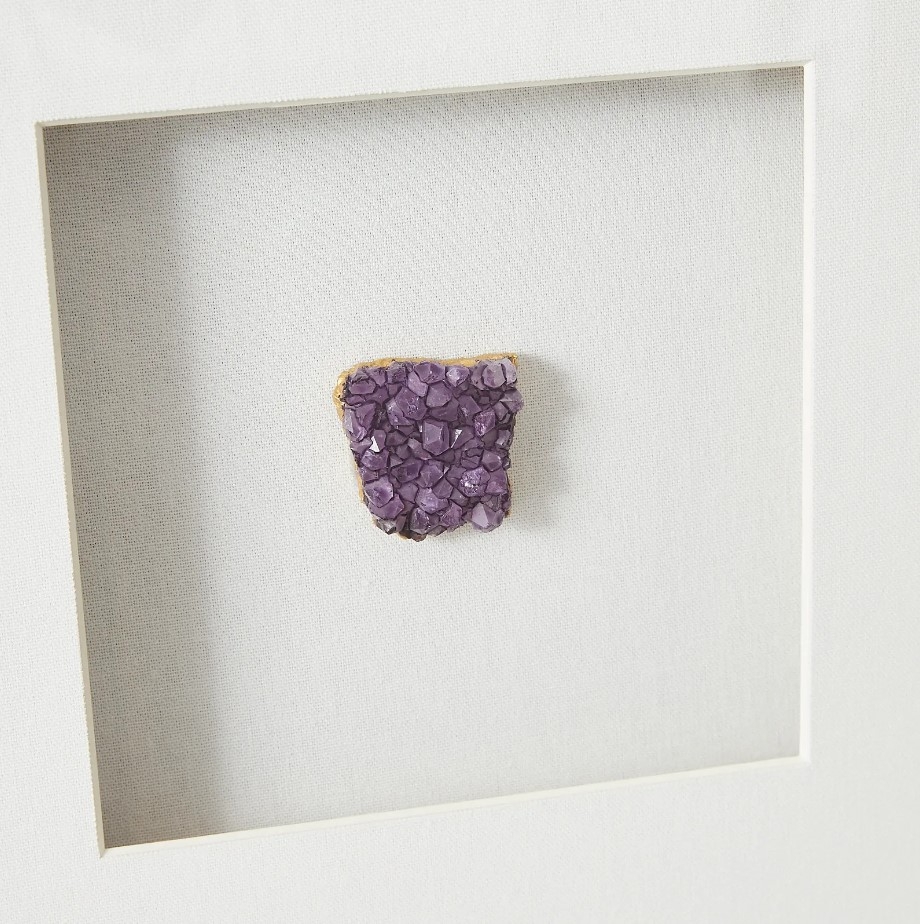 The Violet Crystal Shadow Box is an exquisite art piece that commands attention and exudes a sense of mystical allure. At its heart sits a crystal stone of a deep purple hue, reminiscent of the rich velvet of night skies just after dusk.
