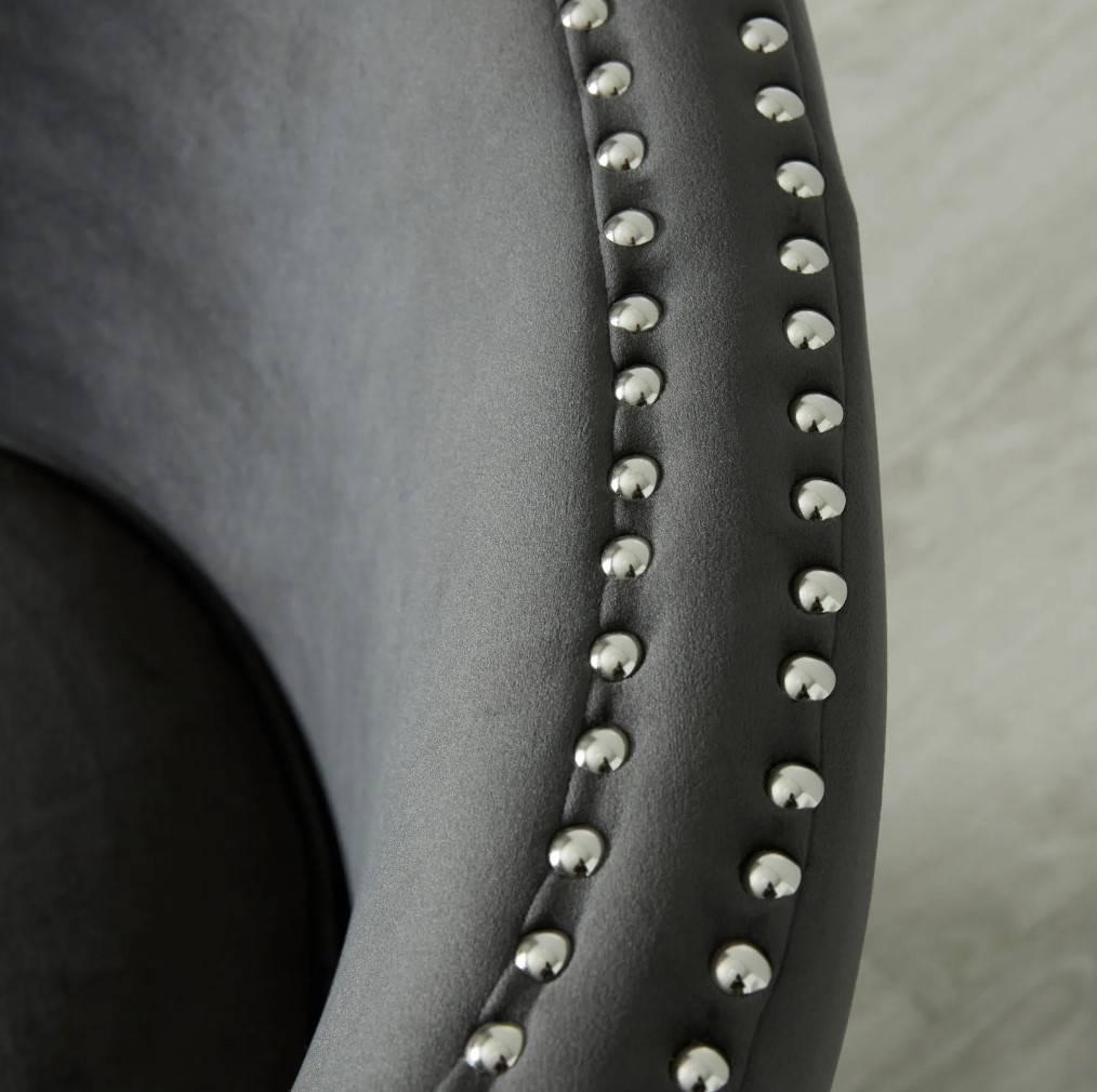 The Vogue Chair showcases luxurious charcoal-coloured velvet upholstery that offers a chic look and a soft, inviting texture. Brass-coloured studs along the frame enhance its stylish appeal, making it a standout piece.