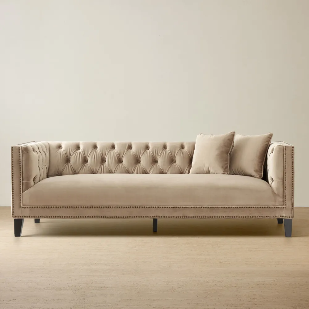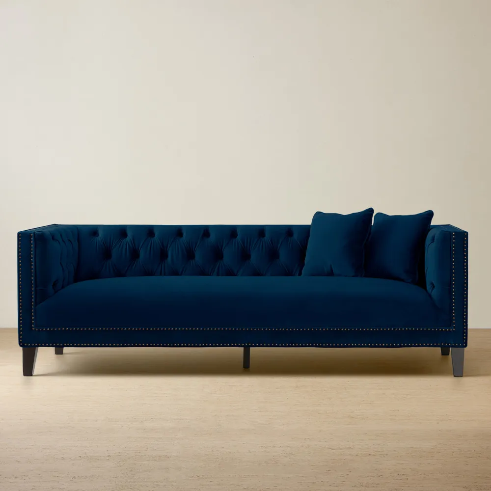 The backrest features hand-tufted velvet in a diamond pattern, adding luxury and extra cushioning. Two rows of coloured studs run along the backrests, armrests, and lower frame, enhancing the Vogue 3-Seater's glamorous look.