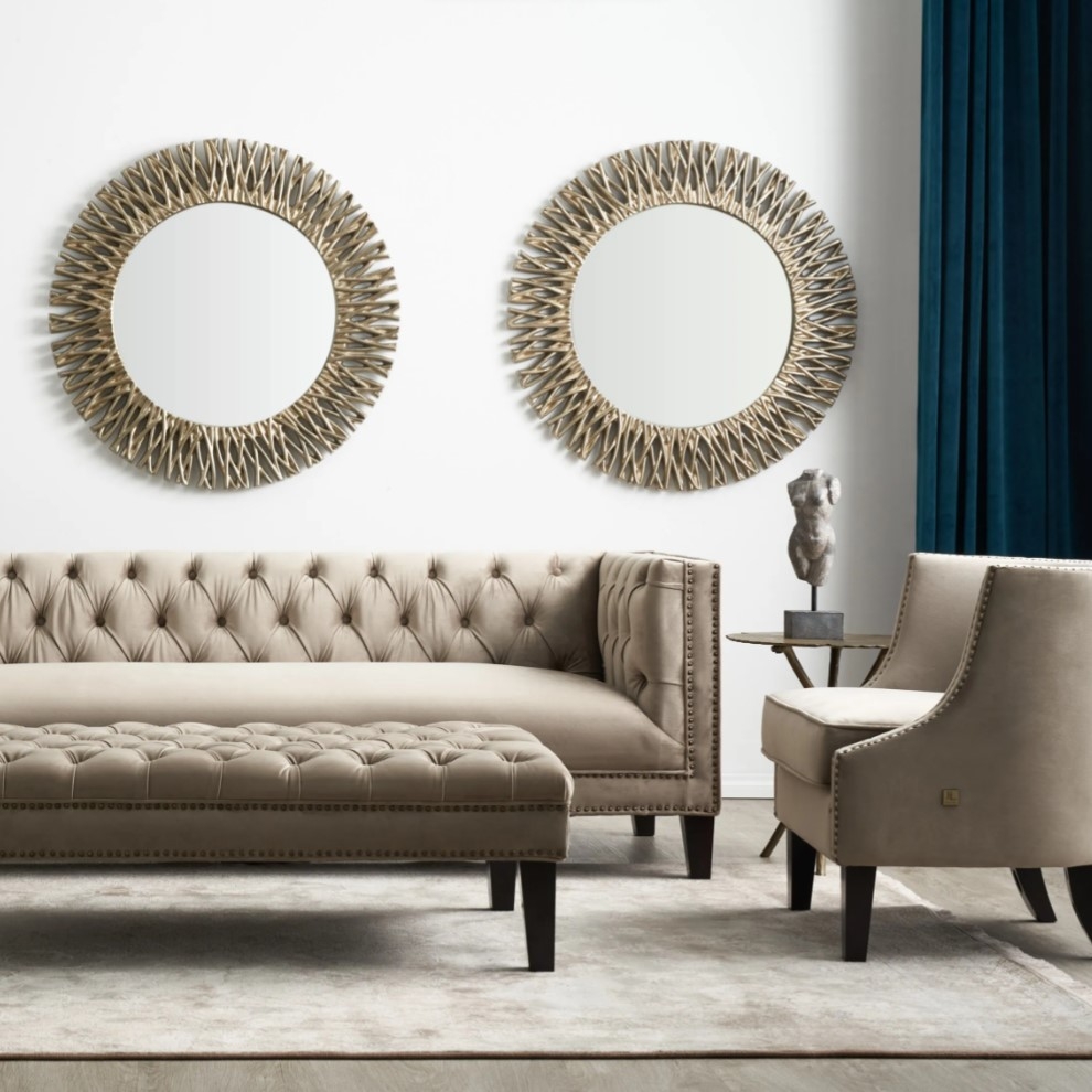 An embodiment of grace and grandeur, the Waverly Antique Gold Round Mirror brings an ethereal beauty to any space it graces. The intricately designed frame, reminiscent of radiant beams of sunlight, is an ode to craftsmanship. Each elegant line, meticulously crafted, seems to dance and shimmer in the mirror's reflection, enhancing the allure of its surroundings.