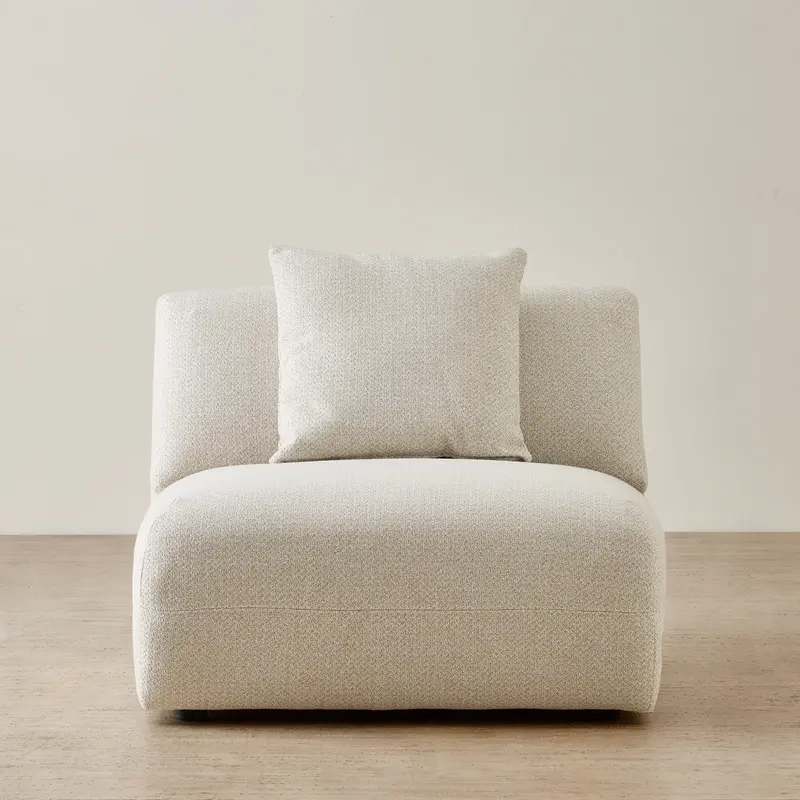 The Willow Modular Armless Seat is upholstered in an ivory beige woven fabric that offers refined texture and soft, natural tone. Its deep seat and gently contoured form create a relaxed, sculptural silhouette that complements any interior.