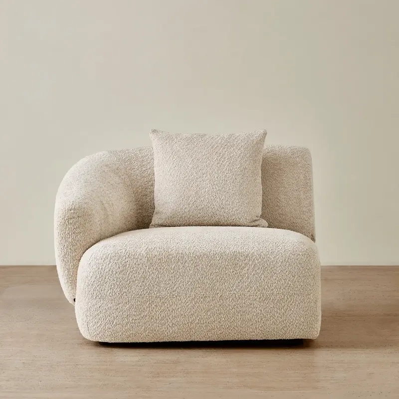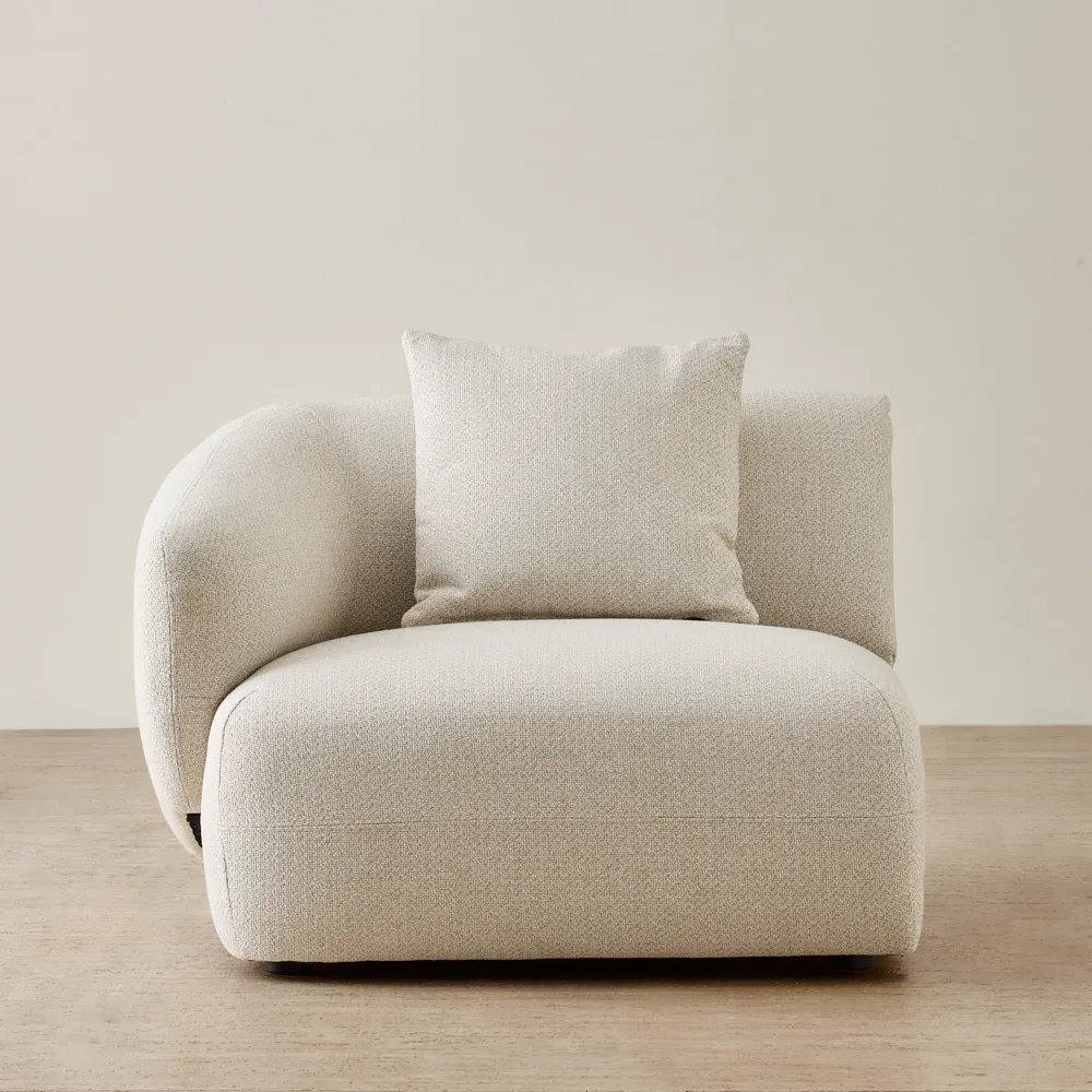 The Willow Modular Left Arm Seat is upholstered in a mid beige woven fabric that offers a rich, tactile texture and a warm, timeless appeal. Its deep seat and gently contoured form create a relaxed, sculptural silhouette that enhances any space.