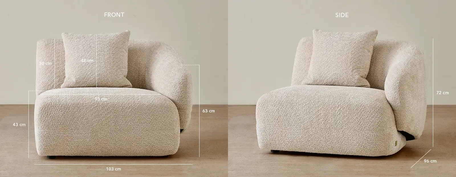 The Willow Modular Right Arm Seat is upholstered in a mid beige woven fabric that offers a rich, tactile texture and a warm, timeless appeal. Its deep seat and gently contoured form create a relaxed, sculptural silhouette that complements any interior.