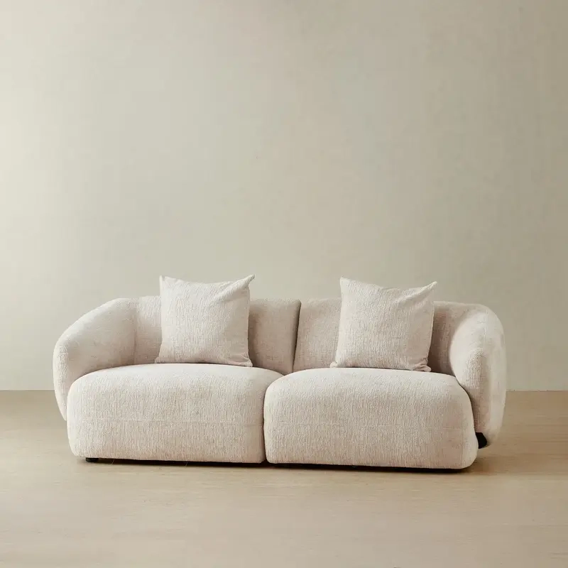 The Willow 2 Pieces Modular Sofa is upholstered in powder white chenille fabric that offers a smooth, inviting texture with a subtle sheen. The deep seats and gently contoured form create a relaxed, sculptural silhouette.