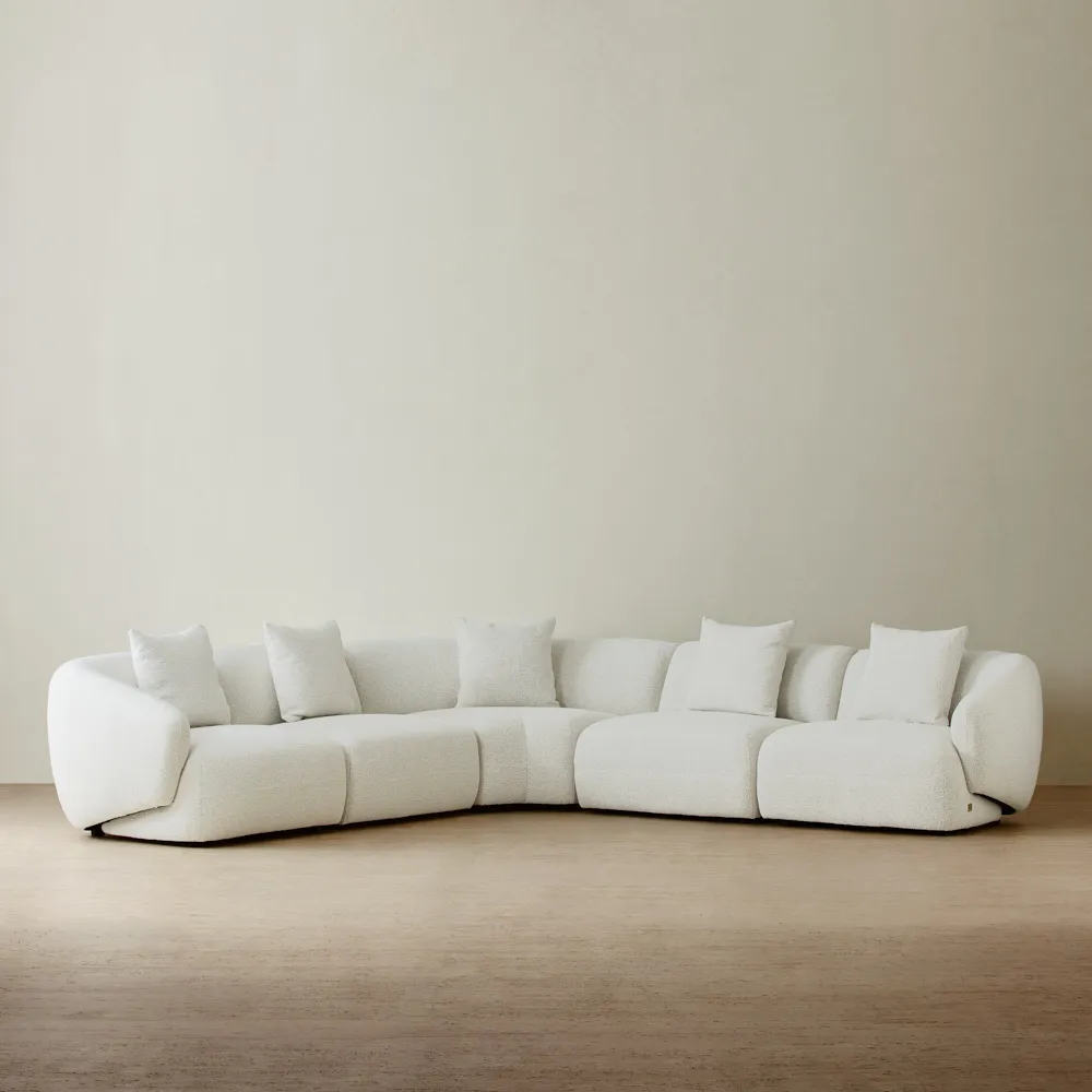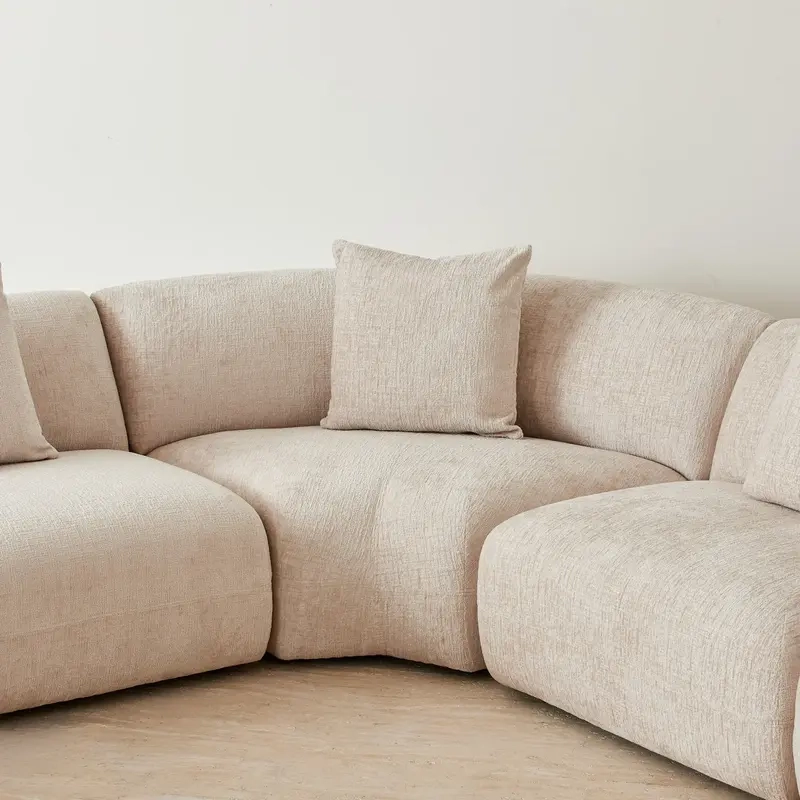 The Willow Modular Corner Sofa is upholstered in a soft powder white chenille fabric that offers a smooth, inviting texture and a subtle sheen. The deep seats and gently contoured form create a relaxed, sculptural silhouette.