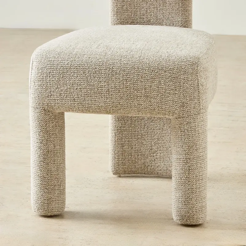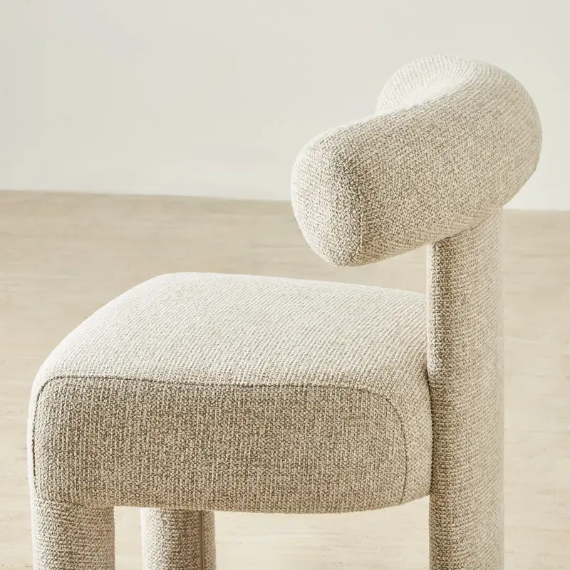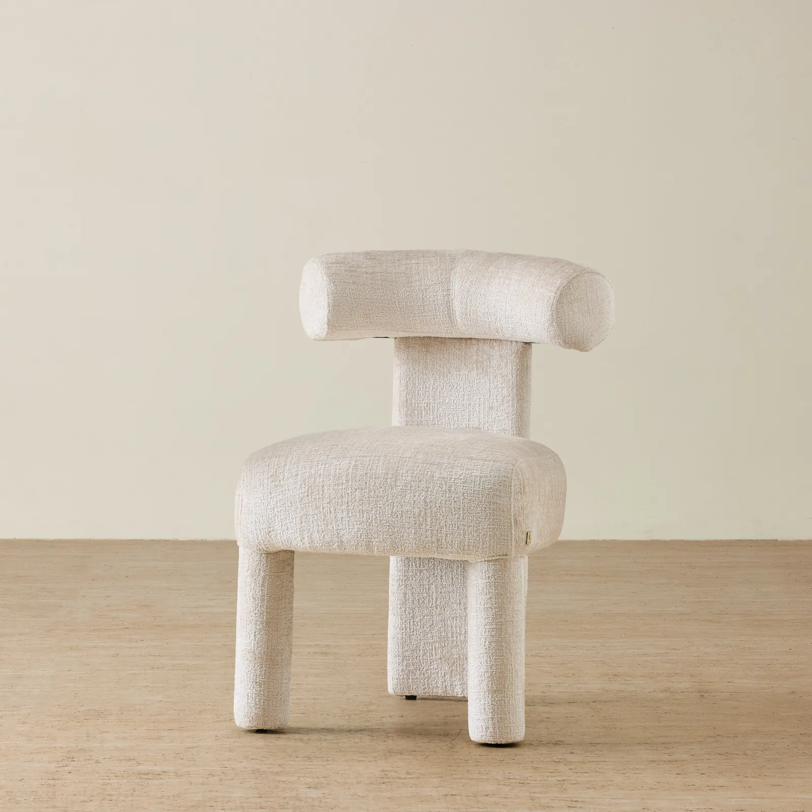 The Wisteria Dining Chair is cloaked in a warm and inviting stone white fabric. Its curved backrest gently wraps around you, offering a sense of comfort.