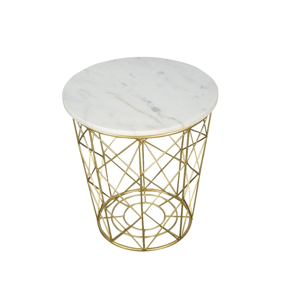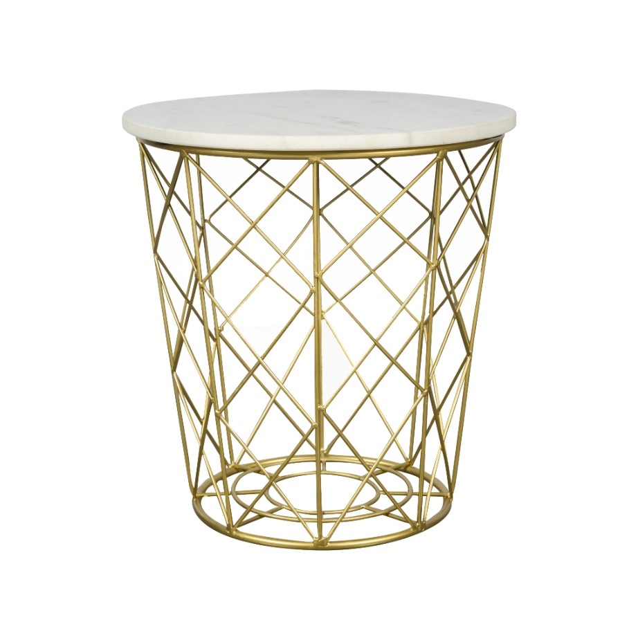 Complementing the marble top is the table's body, an exquisite display of iron lines that intersect to create an open, airy design. This intricate framework is not just a structural necessity; it's a visual delight, offering a modern and artistic take on traditional table legs. The open design of the ironwork contributes to a sense of spaciousness and lightness, making the Wiyot Side Table an ideal choice for both small and large rooms.