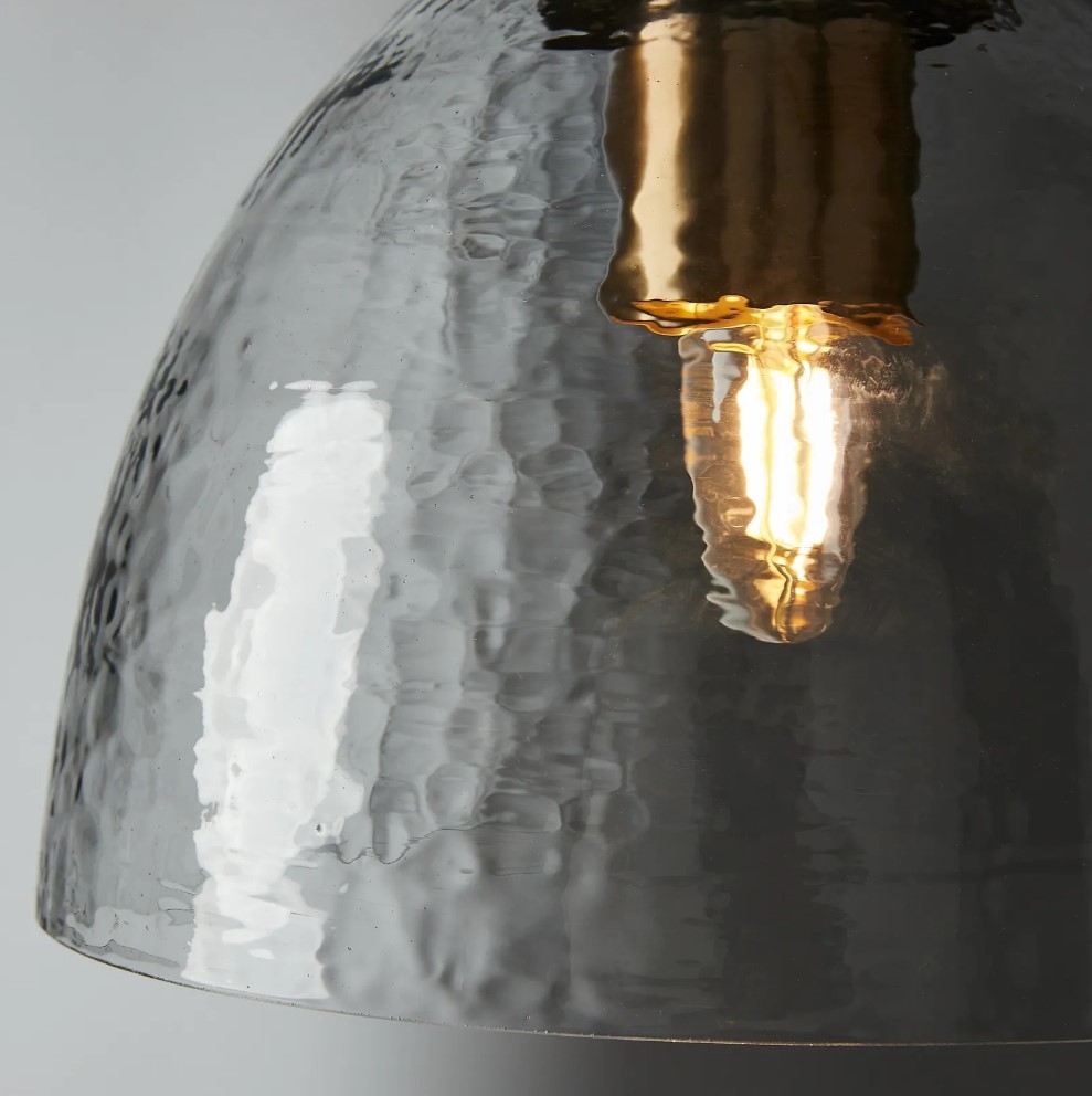 Adding to its distinctive charm is the bulb, ensconced within a mesmerizing, hammered glass cover. This textured glass is an artisan's touch, allowing the light to scatter uniquely, turning a singular glow into a captivating dance of luminous reflections.