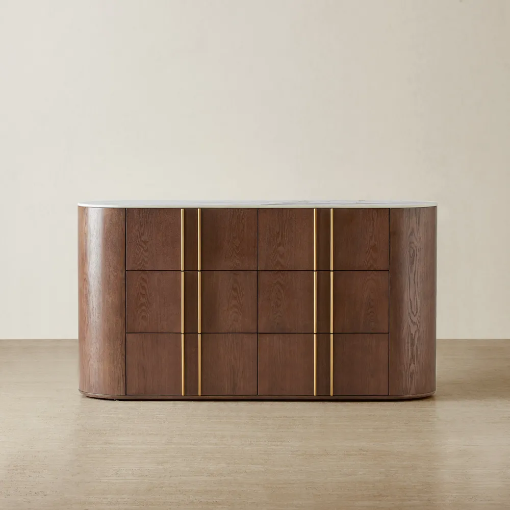 If the Dining room has more of a luxurious orientation, then it's best to reflect on the beautiful implications and surfaces of the Madeleine Mirror Dining Cabinet. Taking you back to the golden age of the art-deco era is its cascading set of mirrors encased in beautiful champagne gold-coloured borders. Speaking of gold, The Helena Antique Glass Dresser uses exquisite panels of distressed glass to decorate its six spacious drawers.
