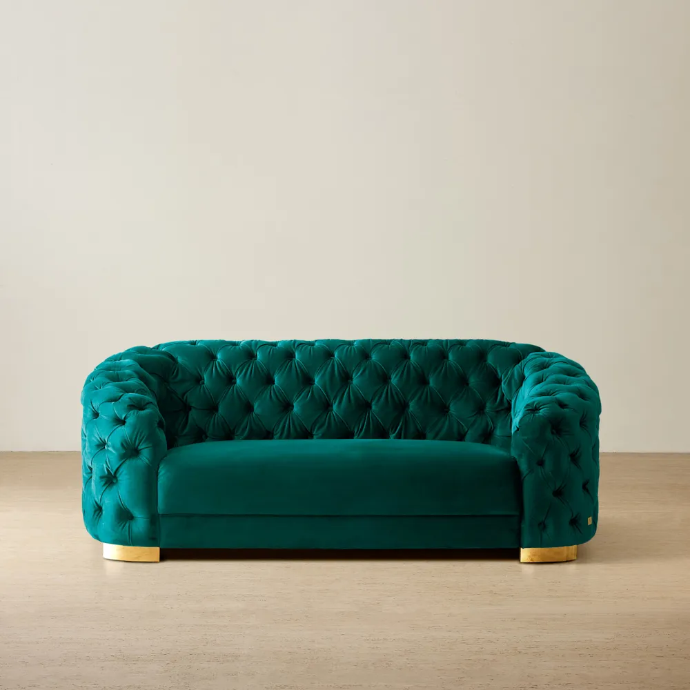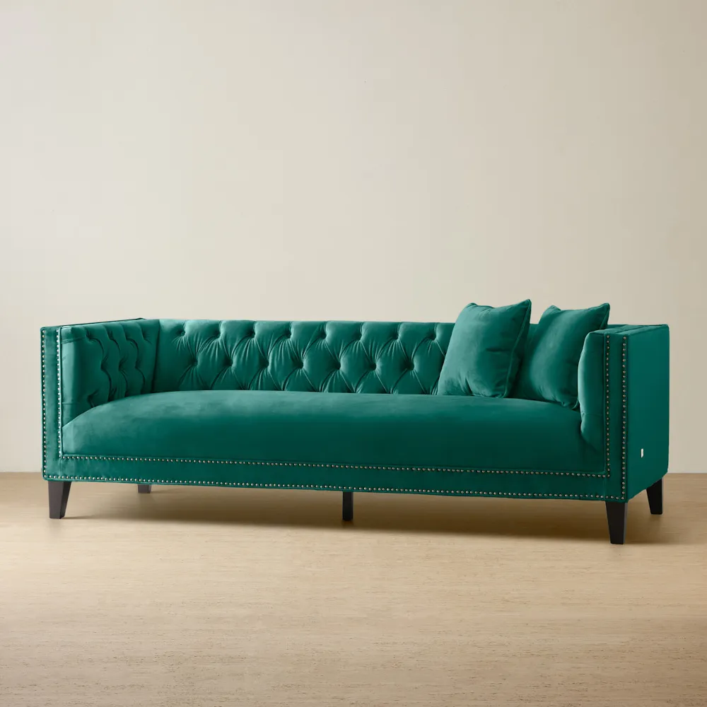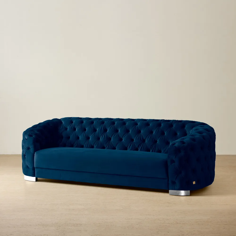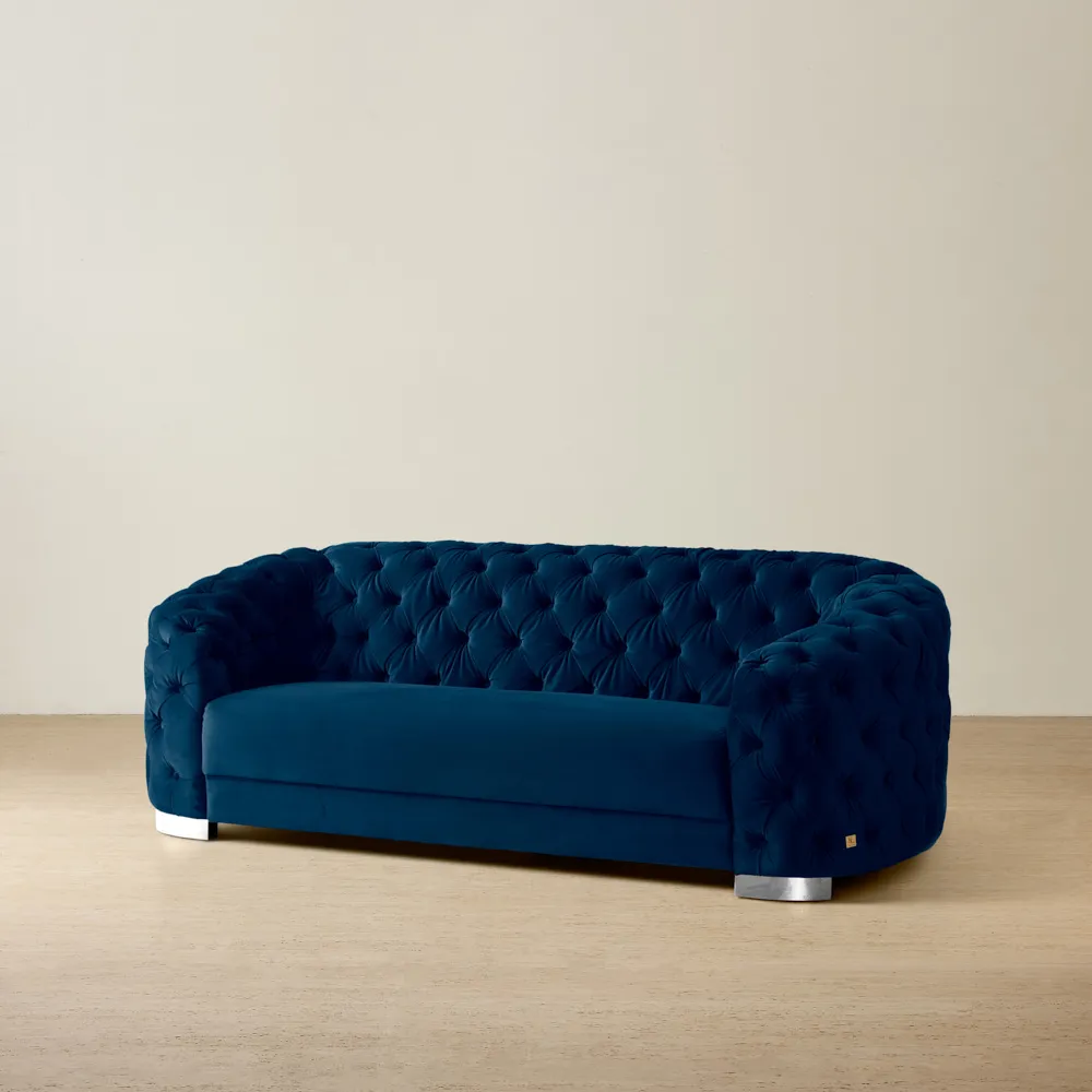 Our collection of blue velvet sofas is available in a range of timeless and contemporary styles to suit every home. Choose a classic tuxedo sofa with its clean lines and squared arms for a refined, structured look. Explore tufted velvet sofas, where button detailing adds depth and a touch of vintage glamour. For a softer aesthetic, our designs with sophisticated curves bring elegance and flow, creating a more relaxed silhouette. Each style is upholstered in plush blue velvet, capturing light with a subtle sheen while offering comfort that feels as good as it looks.