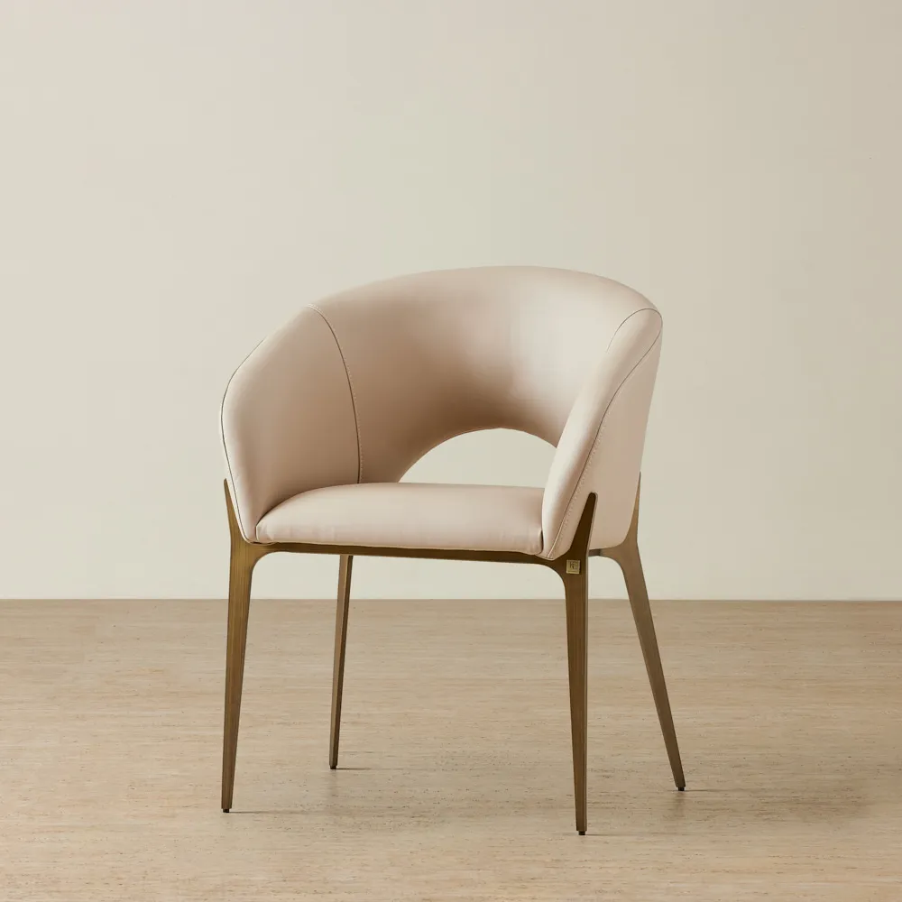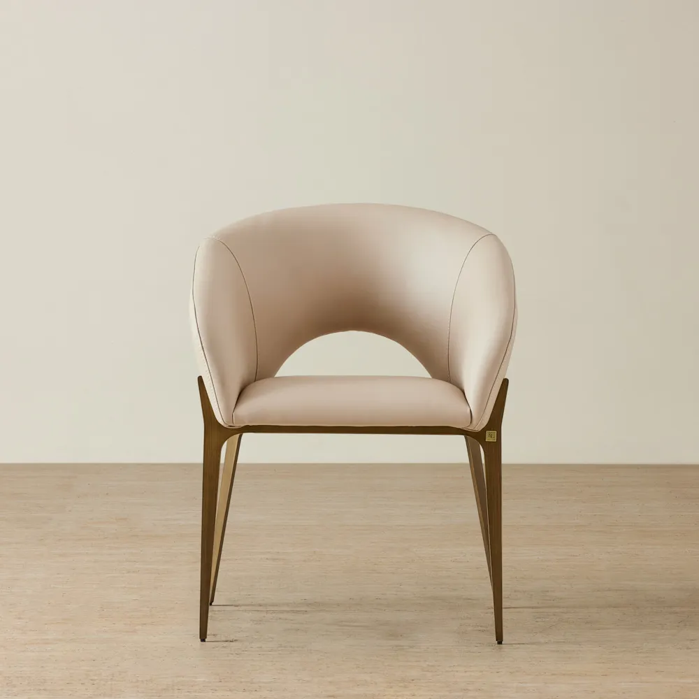 Liven up your homes with our simple and elegant Quinn Chairs. The Quinn Chair - Sand Beige features a gorgeous beige-coloured seat made of premium quality vegan leather that adds a warm aesthetic to any space in your home. A mesmerizing cross-stitched design decorates the entire seated area. Elegant brass-coloured legs flow from the base to provide stability, while a decorative pull ring on the back adds character to the overall aesthetic.