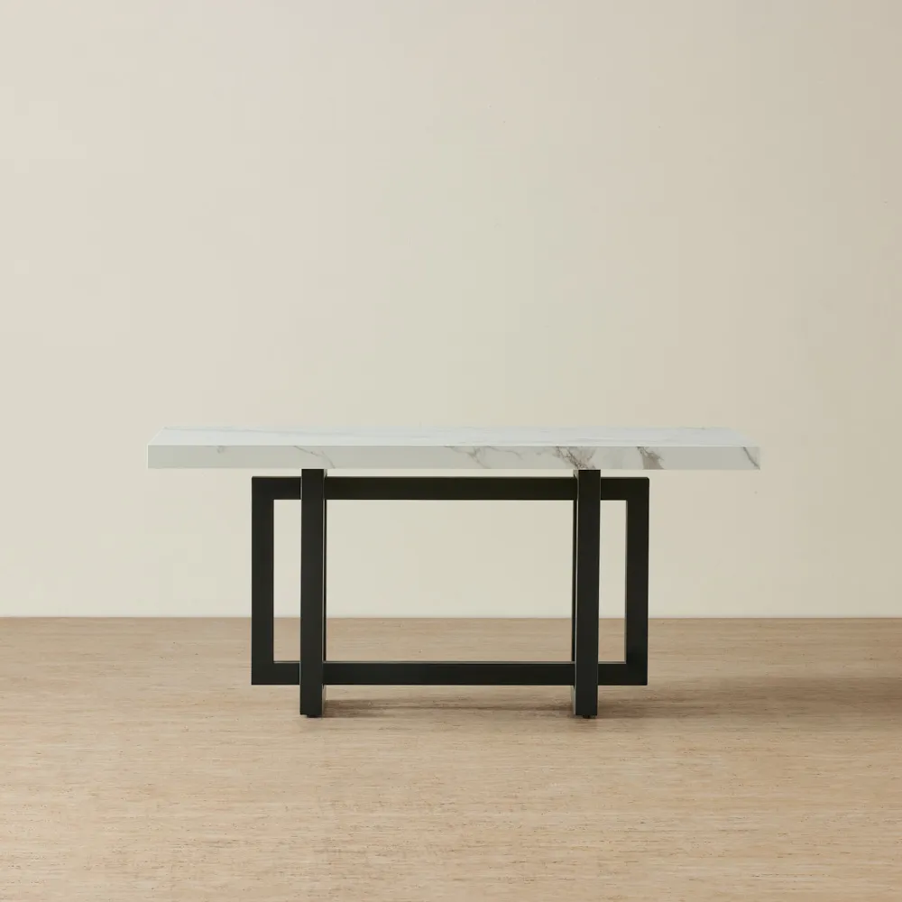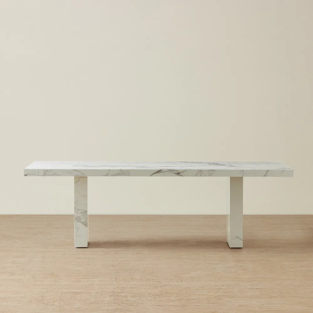 A look of lavishness and luxury resonates from each corner of the Agnes White Marble Rectangle Dining Table, which may be due to its exquisite cut of marble or the striking legs that support each corner. In an unprecedented display of modern design, the Agnes Dining Table features four pairs of twisting table legs. Each one is masterfully crafted to produce a striking sight while providing stability to the piece. A gorgeous cut of rectangular white marble serves as the Agnes' tabletop and is decorated with feint grey veins which add to the piece's mystique.