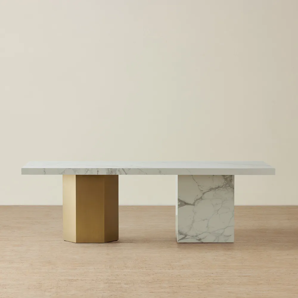 Add a luxe and modern aesthetic to your Dining Area with the Lena White Sintered Stone Dining Table. This magnificent piece draws attention to its contemporary design combined with an almost palpable sophistication. Gather family and friends as you enjoy meals and celebrations on this one-of-a-kind dining table. A gorgeous cut of sintered stone serves as the Lena's spacious tabletop. The Lena offers enough space for up to 10 to enjoy. A cacophony of black-coloured stainless steel converges along the Lena's underside, revealing table legs in striking geometric form.