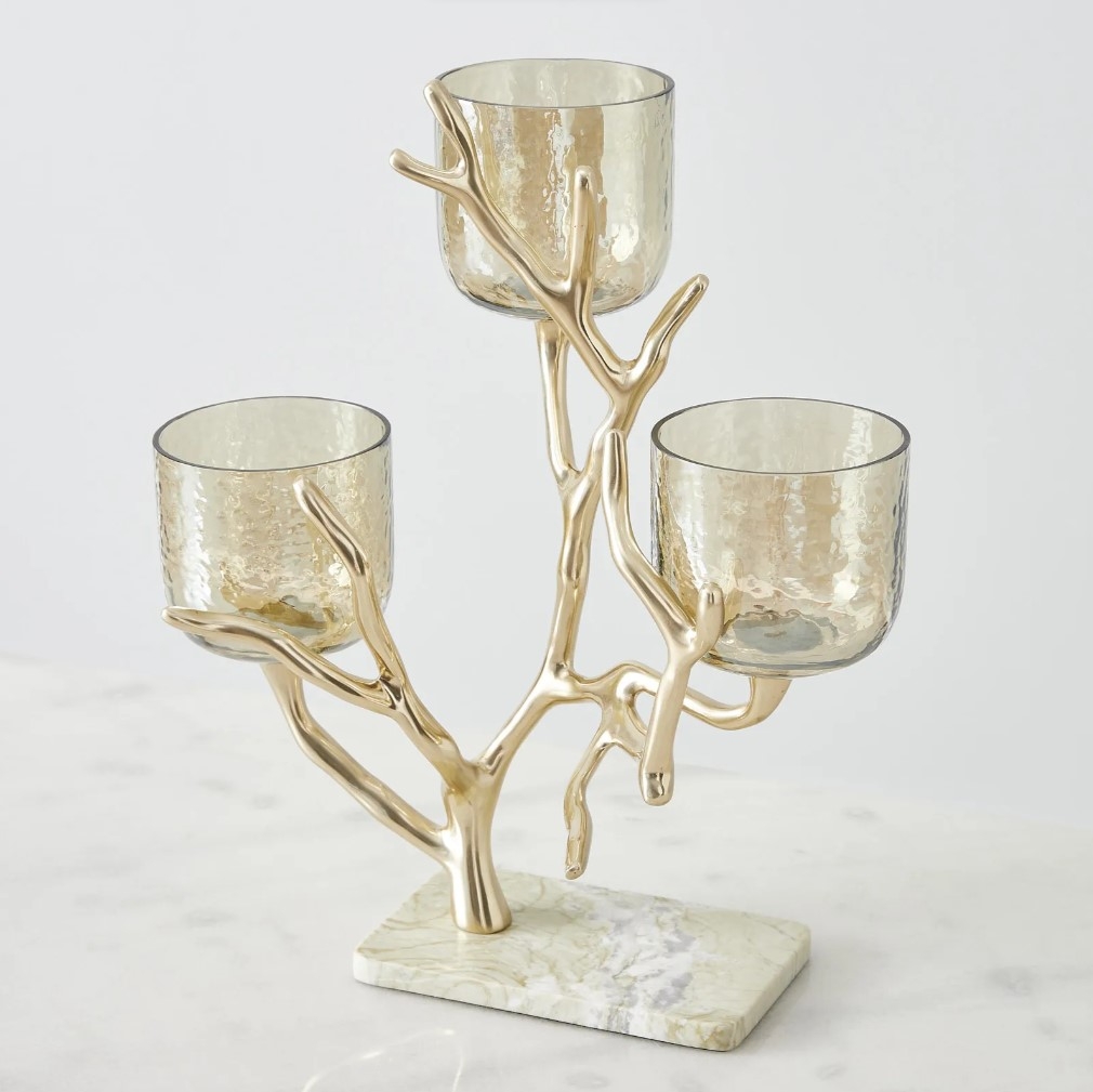This stunning piece draws inspiration from the natural world, resembling a tree with branches, all supported by a pristine white base. The branches, adorned in a golden hue, elegantly spread out and hold three different candle glasses, adding a sense of balance and harmony to the piece. The golden lustre of the branches adds a layer of richness and sophistication, making it a truly standout piece.