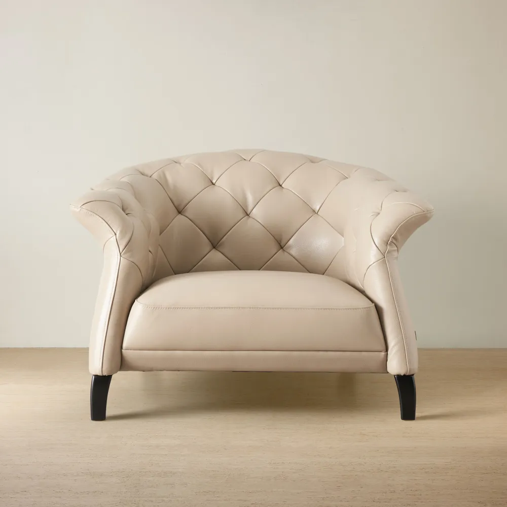 The best-selling leather armchair at Koala Living is the Regal Cream Single Seater. This exquisitely upholstered piece is specially designed to enhance any living space with its masterfully crafted wooden frame. Its flawless elegance brings a touch of marvel to your home, providing enduring comfort for many years ahead.