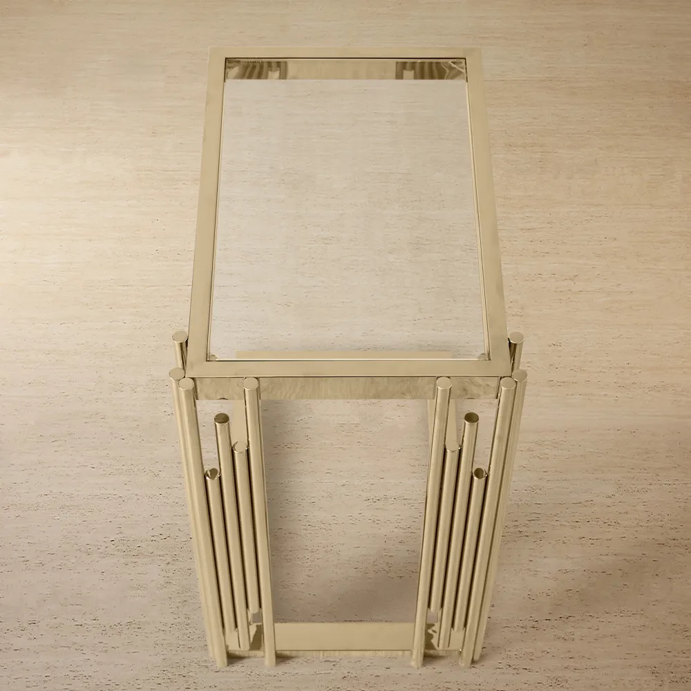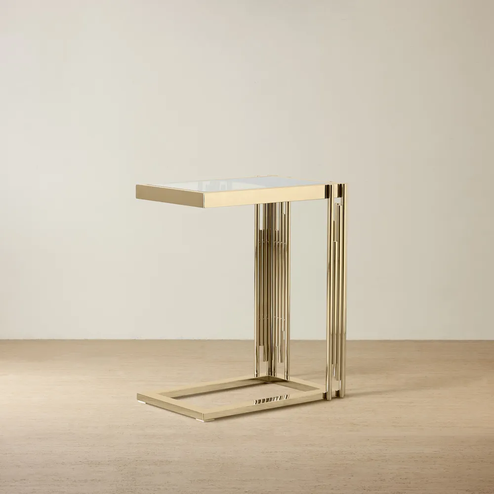 Equally striking, the Jules Polished Silver Stainless Steel Side Table redefines luxury with its art-deco-inspired silhouette and polished silver allure. Constructed from stainless steel tubes in an asymmetric design, it features a clear tempered glass top, offering both beauty and practicality.