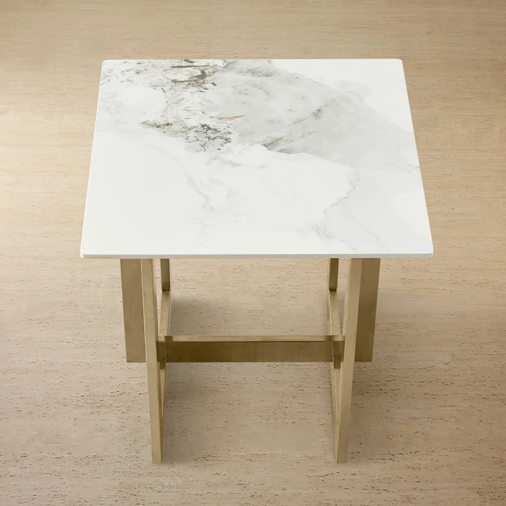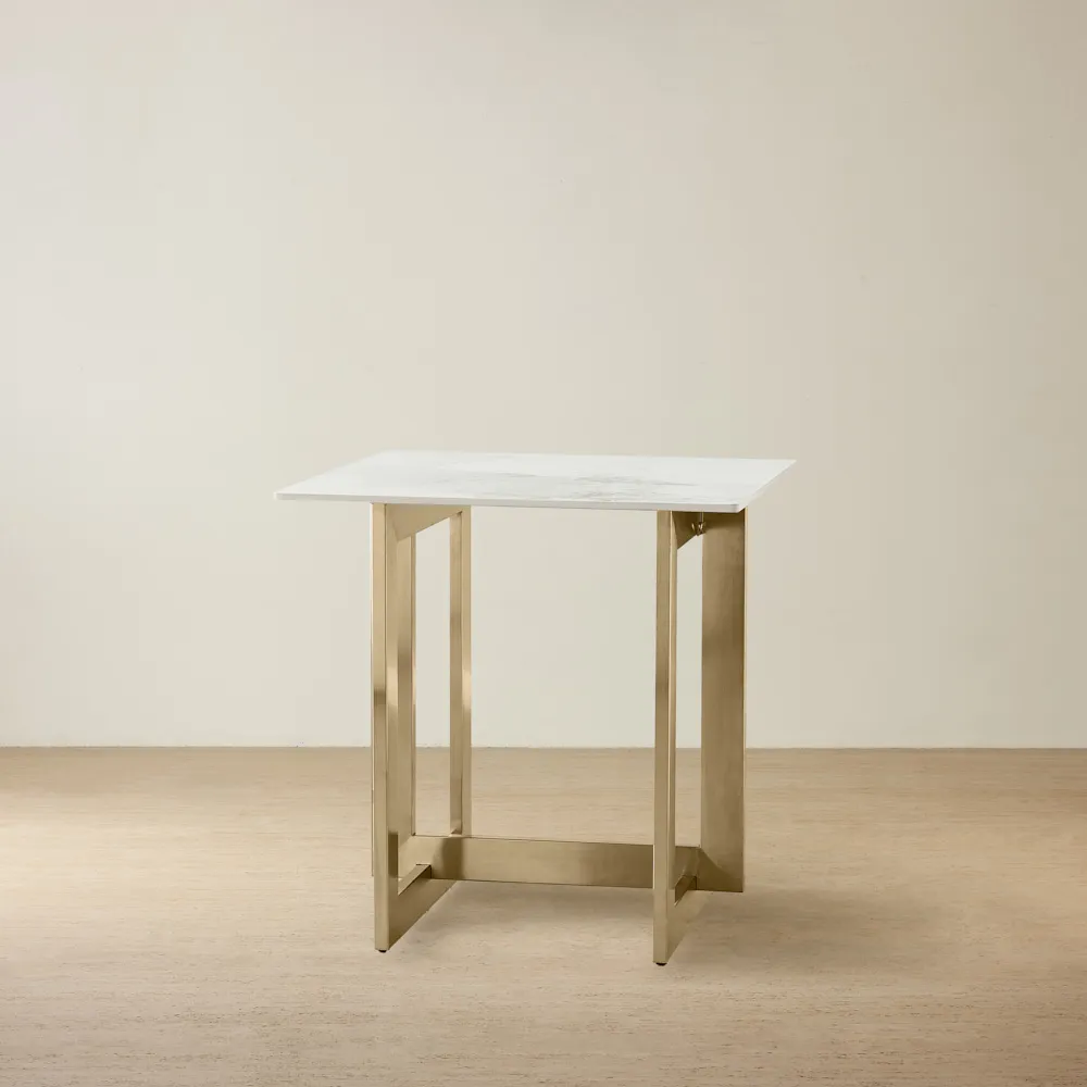 Transform your home into a space of supreme luxury with the Dianne White Sintered Stone Square Side Table. This majestic piece boasts stand-out features that echo the hallmarks of classic Art-Deco design. Feast your eyes on its magnificent Sintered Stone Tabletop. Providing support and adding to the Dianne's luxurious aesthetic is a golden-coloured stainless steel frame made up of three sections, providing asymmetrical balance to the piece.