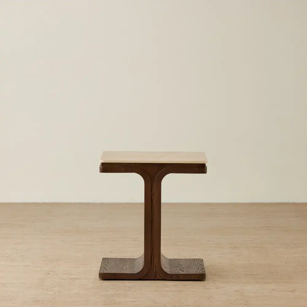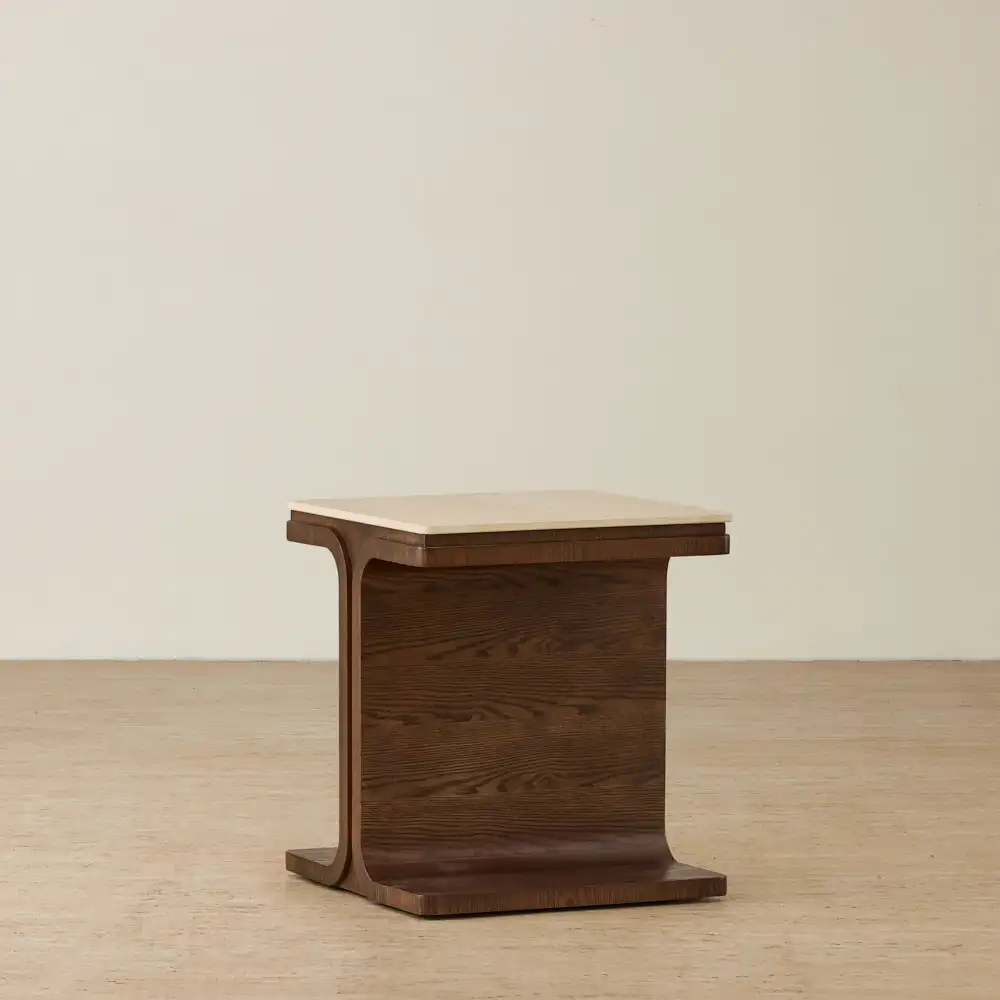 San Pierre Walnut Veneer Side Table with Travertine Finish Sintered Stone Top