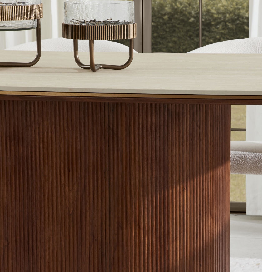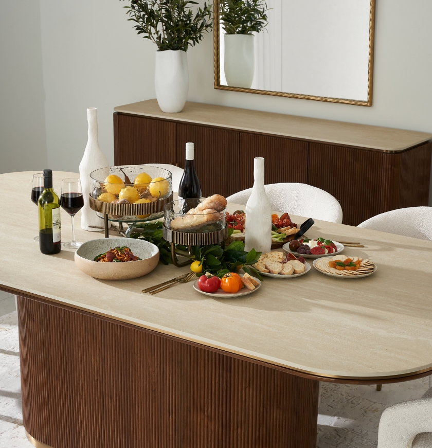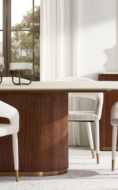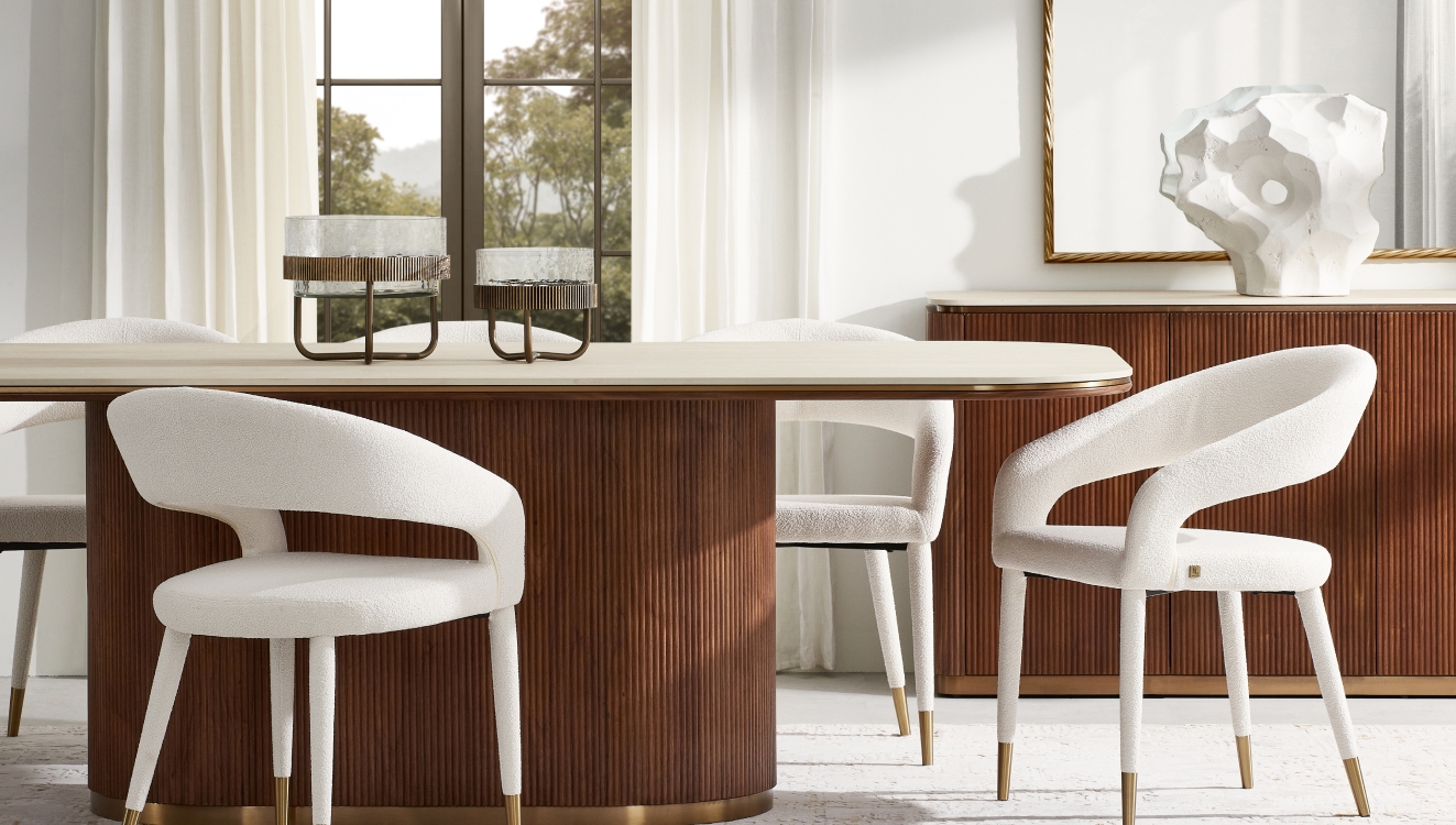 San Pierre is thoughtfully paired with our moulin Chantilly White Fabric Dining Chairs. MOULIN accentuateS ITS GRACEFULLY CURVED BACKREST AND atypical open back design.