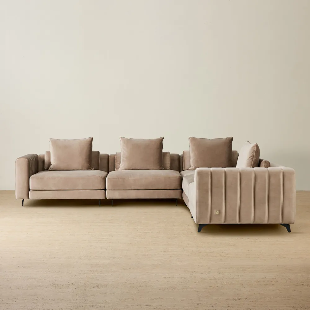 The Thames Collection seamlessly merges nature and luxury, perfectly complementing the Jordan sofa. Each piece features a pristine Calacatta White sintered stone surface, adorned with intricate grey veining that enhances its natural beauty. The stone’s subtly textured finish evokes the raw elegance of a freshly cut slab. The Jordan sofa’s vertical detailing harmonizes effortlessly with the geometric cuts of the Thames Collection’s coffee table, creating a cohesive and sophisticated aesthetic. The coffee table’s golden stainless steel base exudes a cool, refined allure, yet when paired with the Jordan sofa, it strikes a perfect balance of warmth and opulence.
