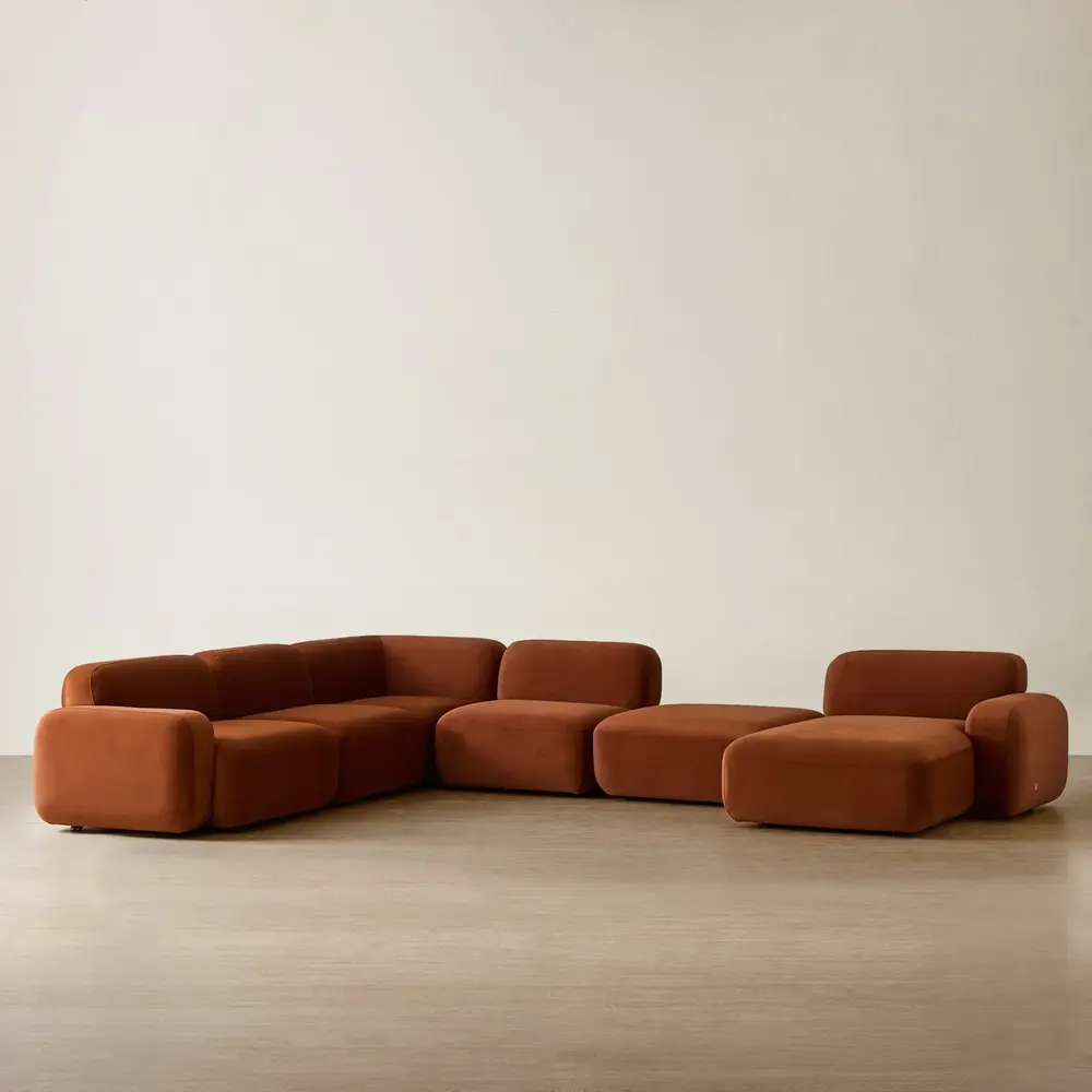 The Capri Modular 1-Seater Armless is wrapped in velveteen fabric that carries a quiet glow, giving the piece a calm richness. Its rounded modular form moves like sculpture, each curve meeting the next in a flow.