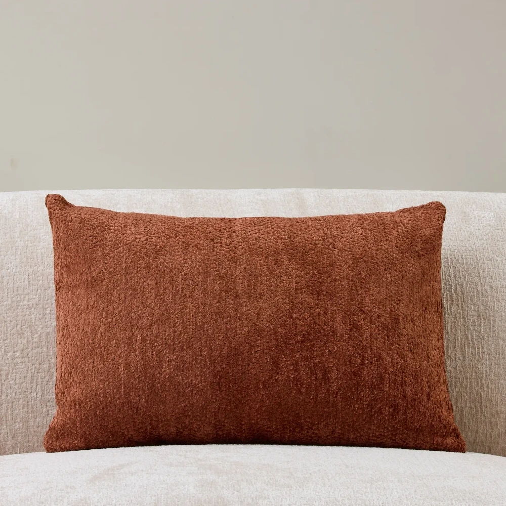 The Caramel Chenille Cushion brings a warm, toasted tone that adds depth without overpowering a space. Its rectangular silhouette is ideal for anchoring larger cushions or adding contrast against lighter upholstery.