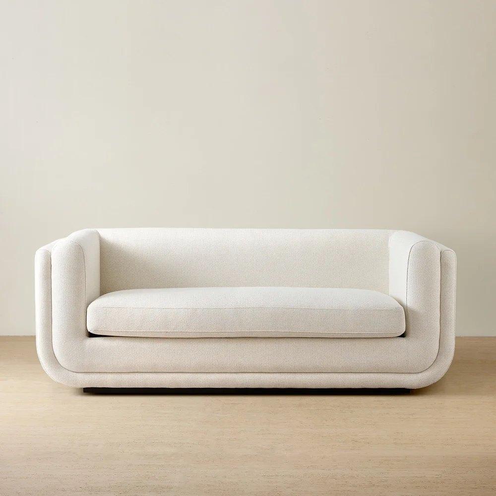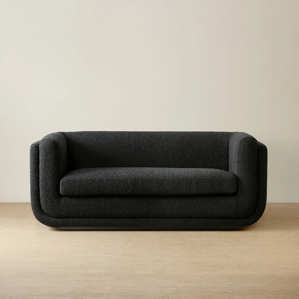 The Clementine Dove Grey Woven 2-Seater Fabric Sofa showcases contemporary design with sleek contours and a modern color palette. Its low-profile stature adds to its relaxed charm.