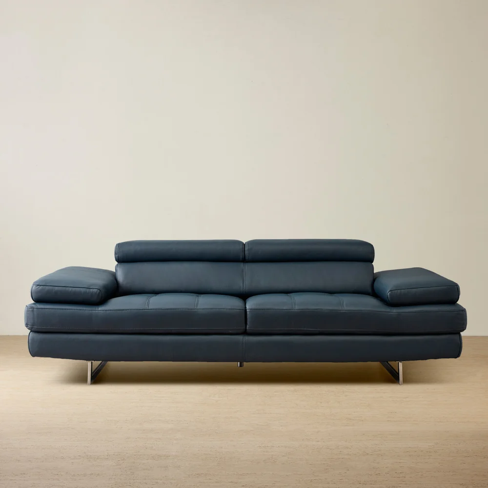 Love the sofa, it is a unique navy blue. It's a great sofa for not blocking the view, especially from other positions/ perspectives in the room. Being able to raise the headrest and armrest to various positions (without the heavy motorised components) makes for comfortable options when sitting for longer periods, and it is also easier to move. All this, plus having clear, unobstructed views, makes this sofa a winner. I know I bought two!