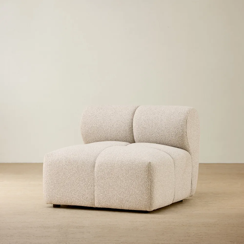 The Quincy Armless Module is shaped with a rounded, low-profile form that keeps the silhouette smooth and versatile. Upholstered in stone cream woven fabric, it brings soft texture and a warm, relaxed look that settles easily into any setting.