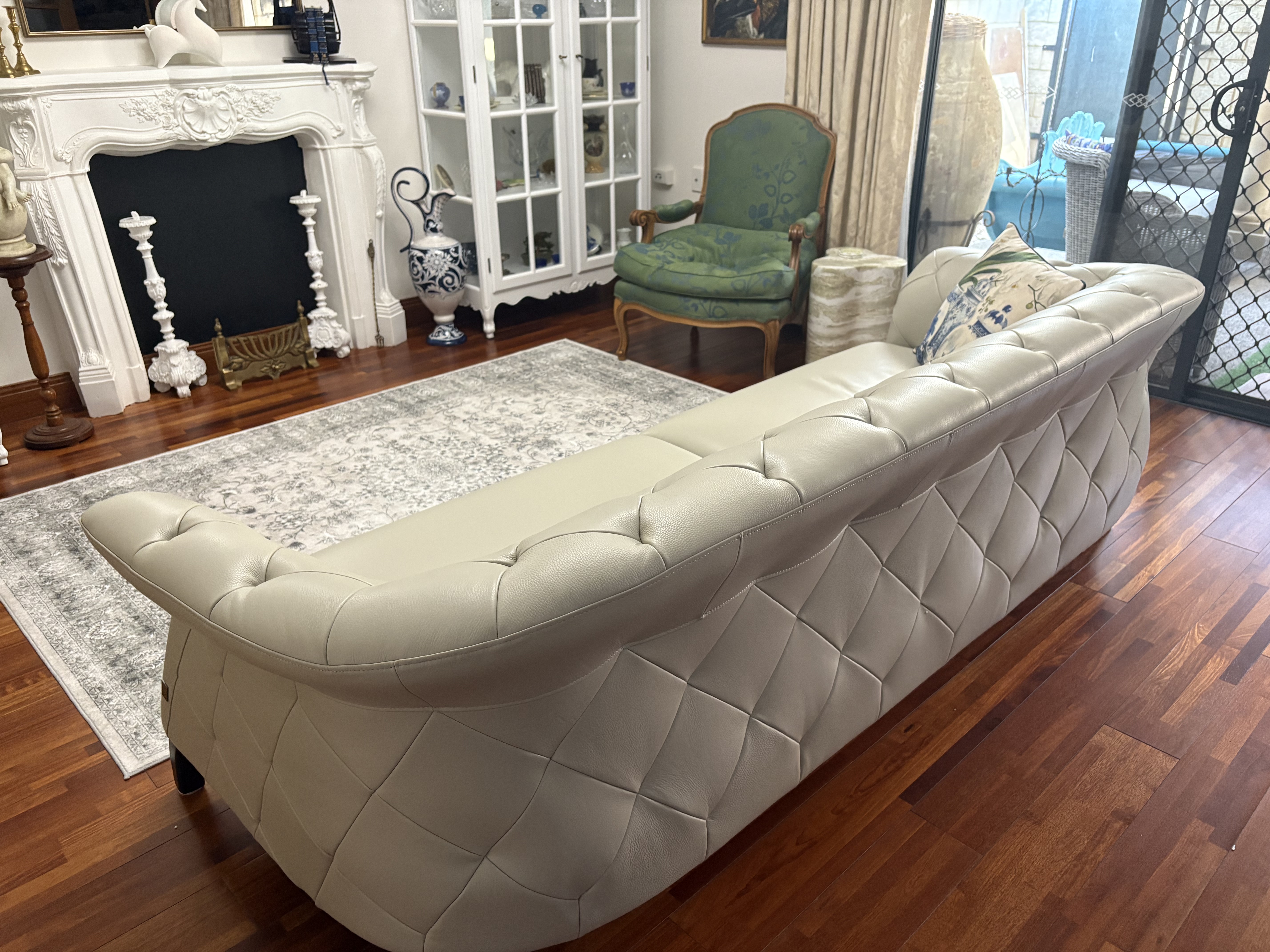 The Regal 3-Seater Sofa features deep, diamond-shaped tufting that adds depth and texture to its appearance. This detailing, combined with taupe-coloured leather, enhances both its look and comfort.