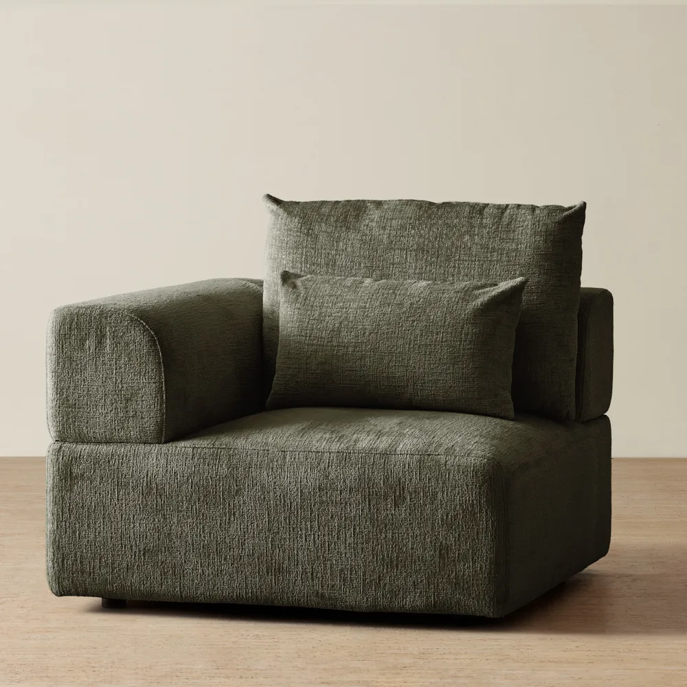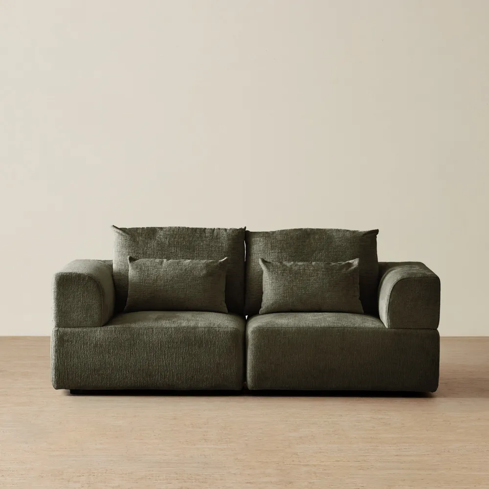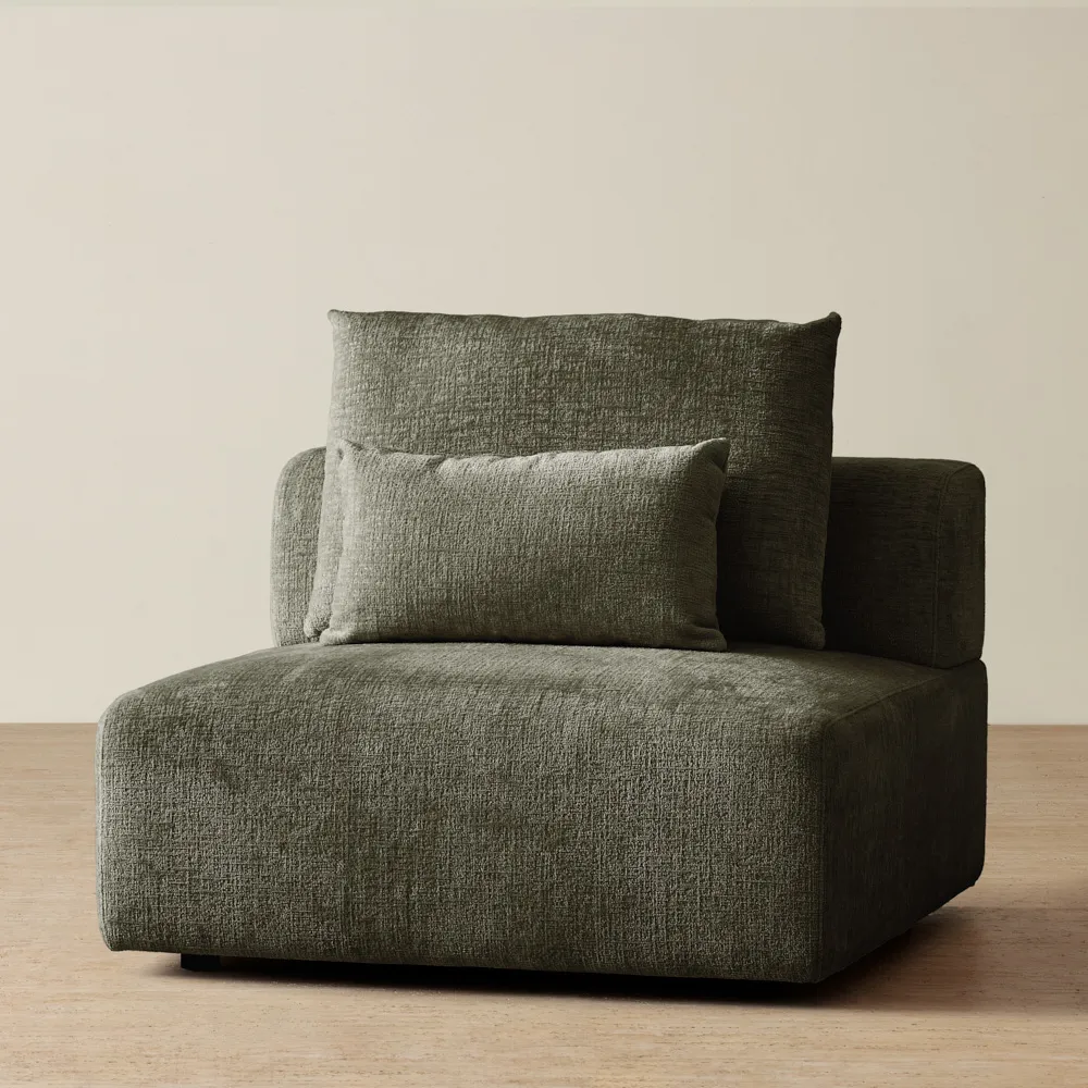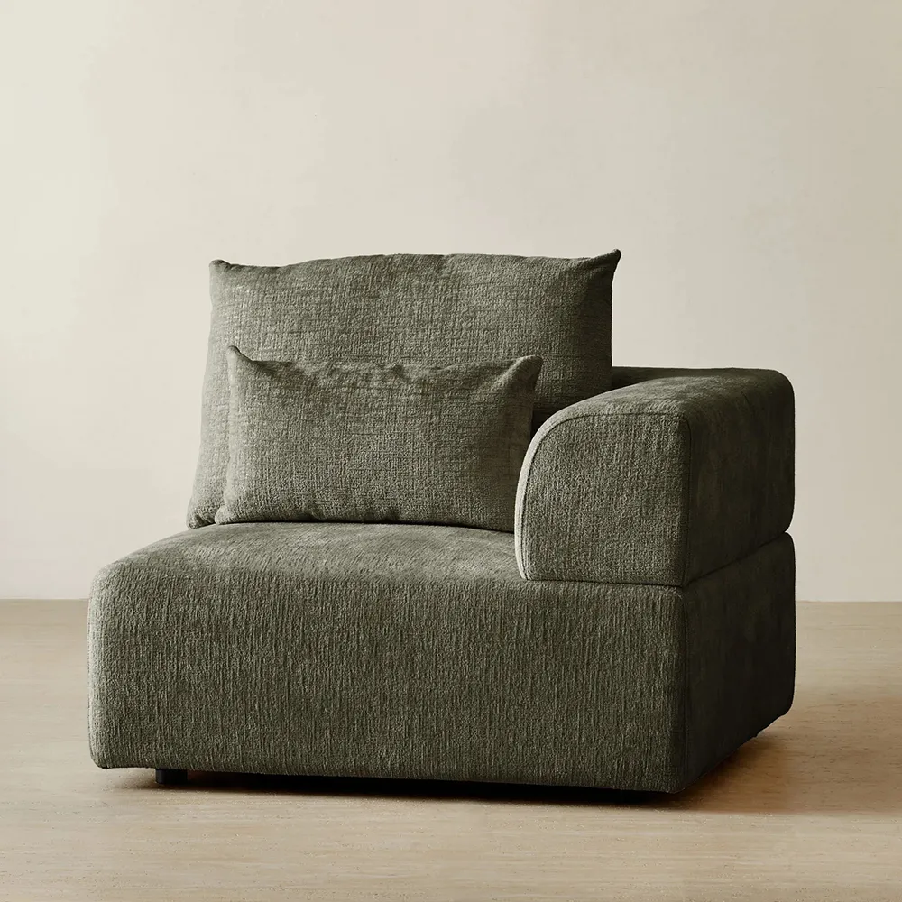 The Riviera III Green Chenille Fabric Modular Sofa is upholstered in plush green chenille, offering a luxurious texture and a deep, inviting hue. Its rich, earthy tone brings a sense of warmth and character to any interior, creating a serene and stylish space for relaxation.