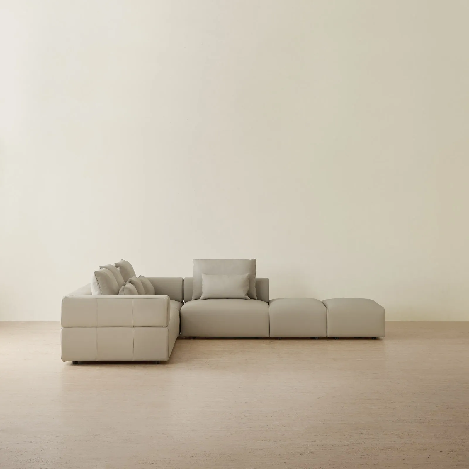 The Riviera Modular Sofa is wrapped in milk coffee leather, offering a smooth, supple finish with a warm, grounded tone. Its clean lines and low-profile form allow the leather to take centre stage.