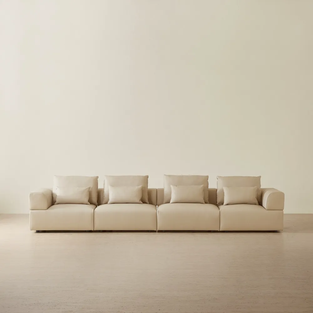 The Riviera Modular Sofa is wrapped in milk coffee leather, offering a smooth, supple finish with a warm, grounded tone. Its clean lines and low-profile form give the leather space to breathe, creating a look that feels luxurious and modern.
