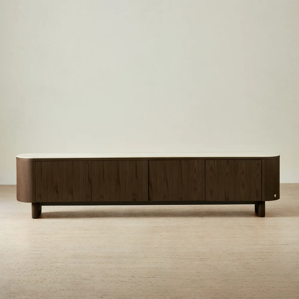The Sierra Entertainment Unit is crowned with a sintered stone top that adds both durability and presence. Its elongated form creates a strong foundation for screens and décor.
