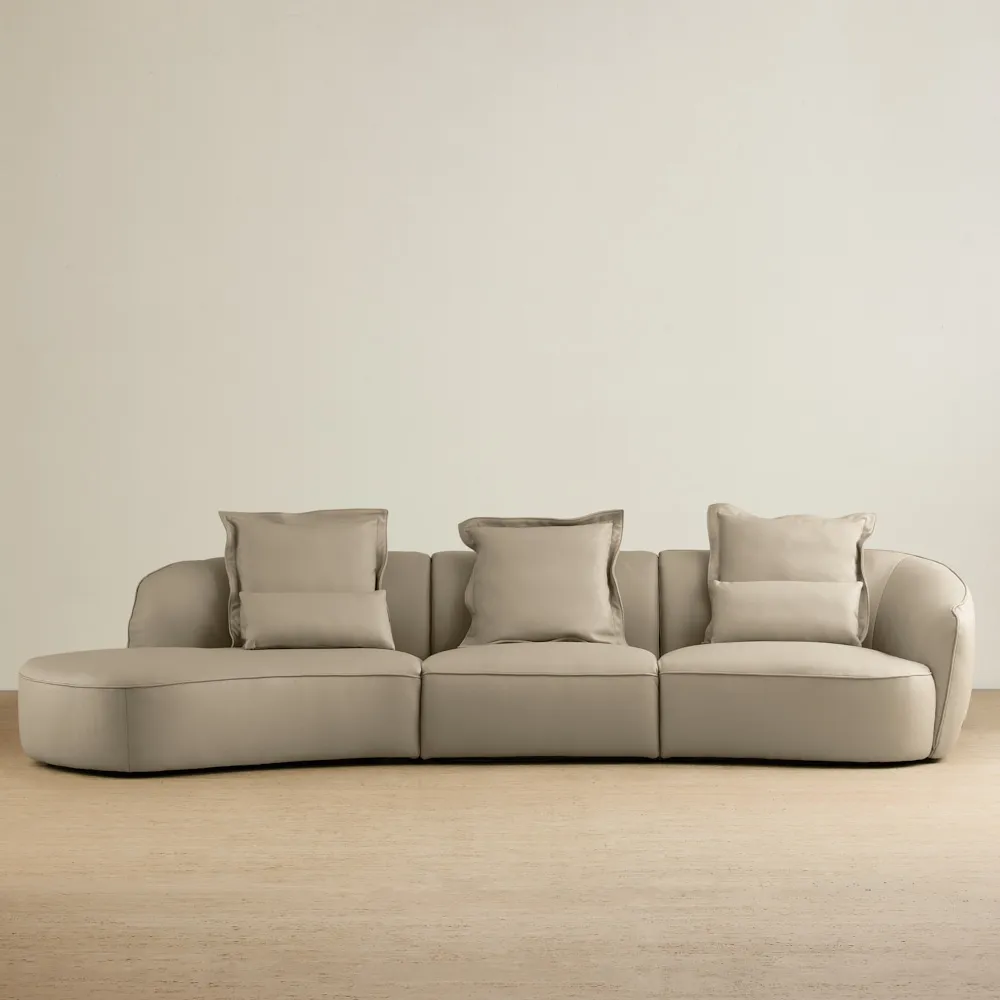 Wrapped in coffee brown leather, the Spencer carries a smooth, plush finish with a rich depth that warms the room. Its low-lying form keeps the silhouette relaxed and modern, with clean panel detailing that gives the piece quiet structure.