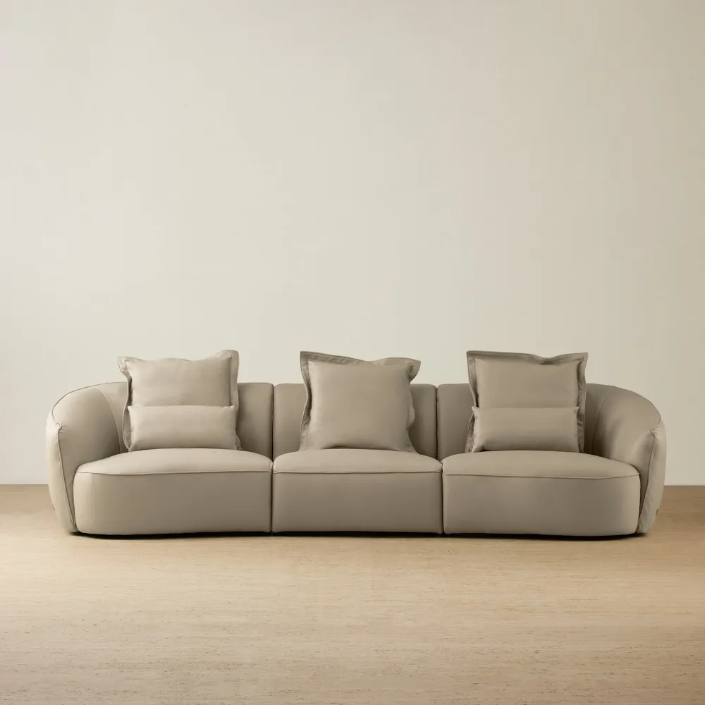 The Spencer Modular Sofa is wrapped in milk coffee leather that feels smooth, plush, and softly finished. Its low-lying form keeps the silhouette relaxed and modern, with clean paneling that lets the material do the talking.
