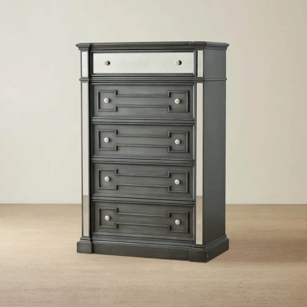 Solitude Antique Silver Tallboy combines the elegance of the Hamptons with the showstopping design of the art-deco style to bring an undeniable luxe look to the bedroom. Its true brilliance lies within the craftsmanship of the finely textured wood that forms its foundation. Every inch of this exceptional piece is meticulously crafted, showcasing the natural beauty of the wood as it gracefully blends with the enchanting antique silver shade.