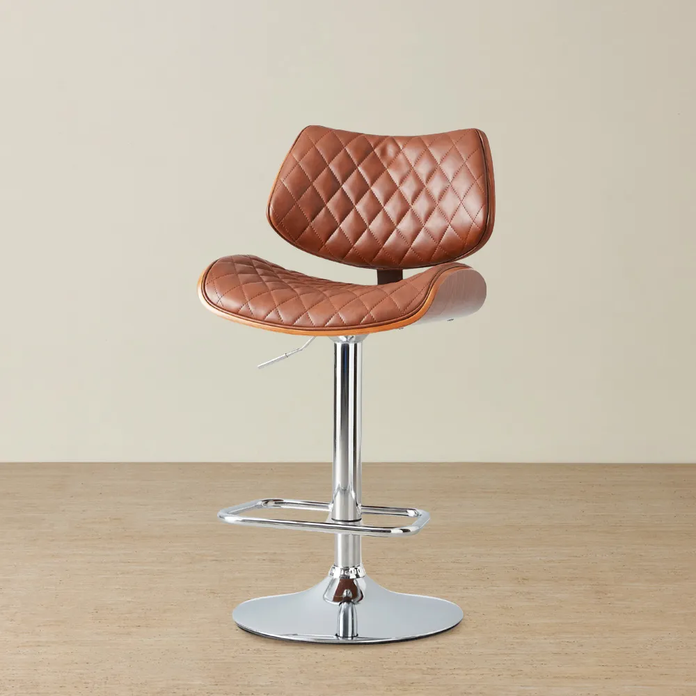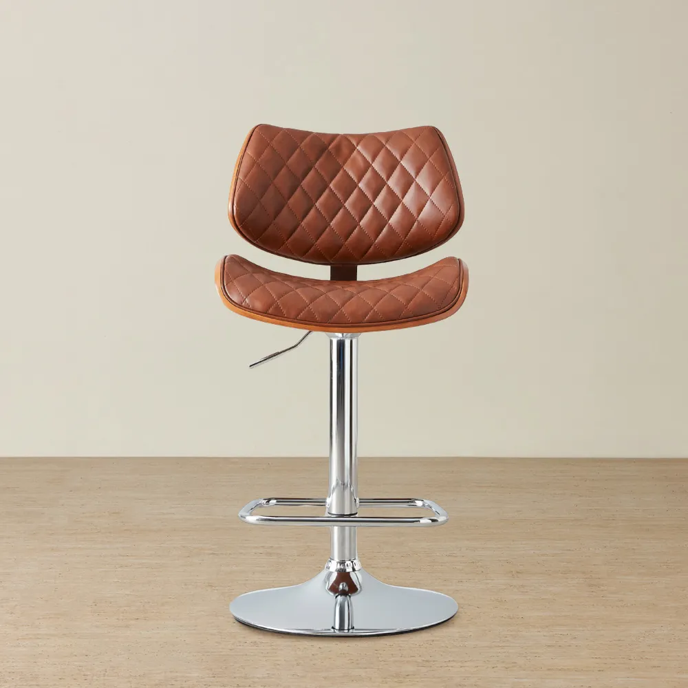 Wine and Dine in absolute delight with our Draco Dark Brown Vegan Leather Bar Stool. Crafted with meticulous attention to detail, the Draco is upholstered in high-quality vegan leather, showcasing a warm dark brown shade. Its backrest features visible horizontal stitching, dividing it into distinct segments and giving it a stand-out look. Positioning yourself in the Draco Bar Stool is a breeze, thanks to its swivel design and integrated footrests. Incorporating both style and utility, the Draco Bar Stool is equipped with a gas lift mechanism that allows you to adjust the Barstool's height.