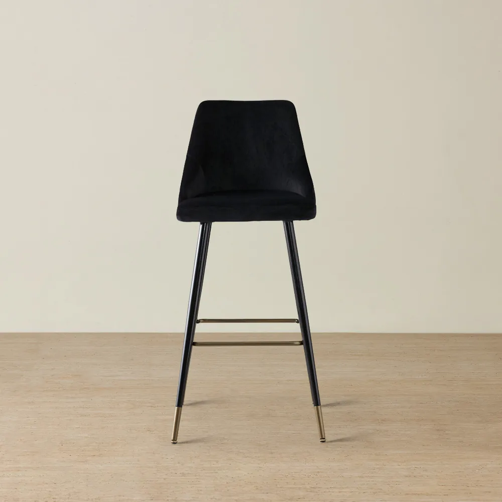 The Amber Navy Velvet Bar Stool conveys its elegance with the curves of its creatively designed seat and stand-out colours. Relax on its masterfully crafted seat that echoes a beautiful shell from the sea, generously upholstered with rich navy velvet fabric and dense foam. Adorning the Amber's backrest are channel tufts that add a plush look and another layer of elegance. Providing support to the seat is a set of black stainless steel legs with luxe golden tips: interconnected by a golden footrest.